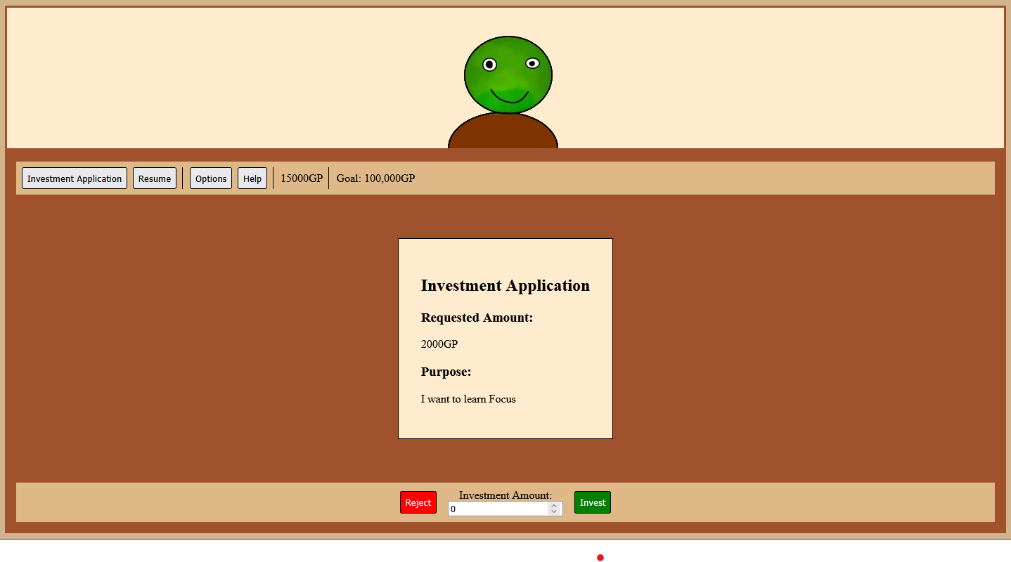 A simple but entertaining game for a while. Maybe to make it more interesting you could add some short-term goals for the player, like advisors who give more info about how good the person requesting money is in their field, maybe their criminal record, or even being able to pay an investigator for more details—just throwing out some random ideas. Good job!