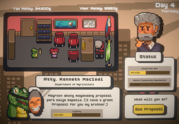 Wow, this feels really polished! A corrupt mayor using people's money to fuel his gacha addiction is hilarious, I like it.