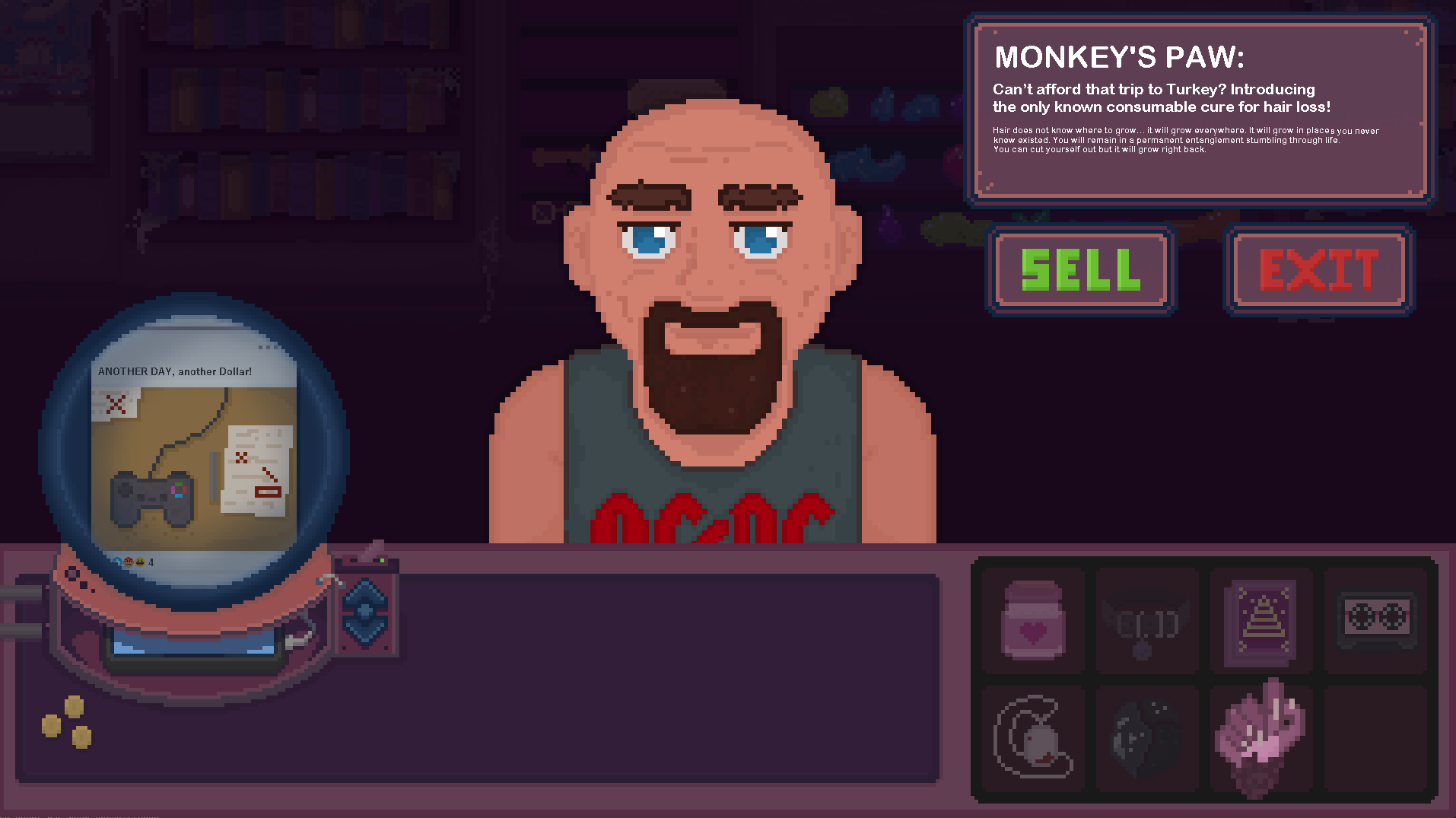 No, we didn't have time to add an in-game element to the curses just yet so just playing on human conscious and funny disclaimers, if you can read them. The risk for the player also applies to potential failure as too many wrong guesses make customers suspicious, and they leave. You need a perfect sales score to pass; the player is essentially making risky sales to be freed from purgatory.