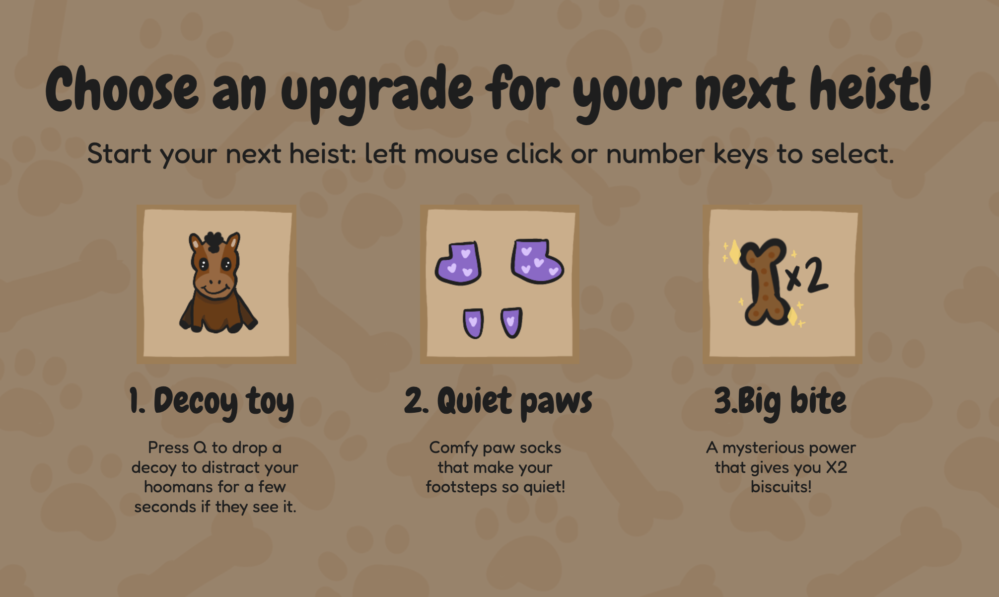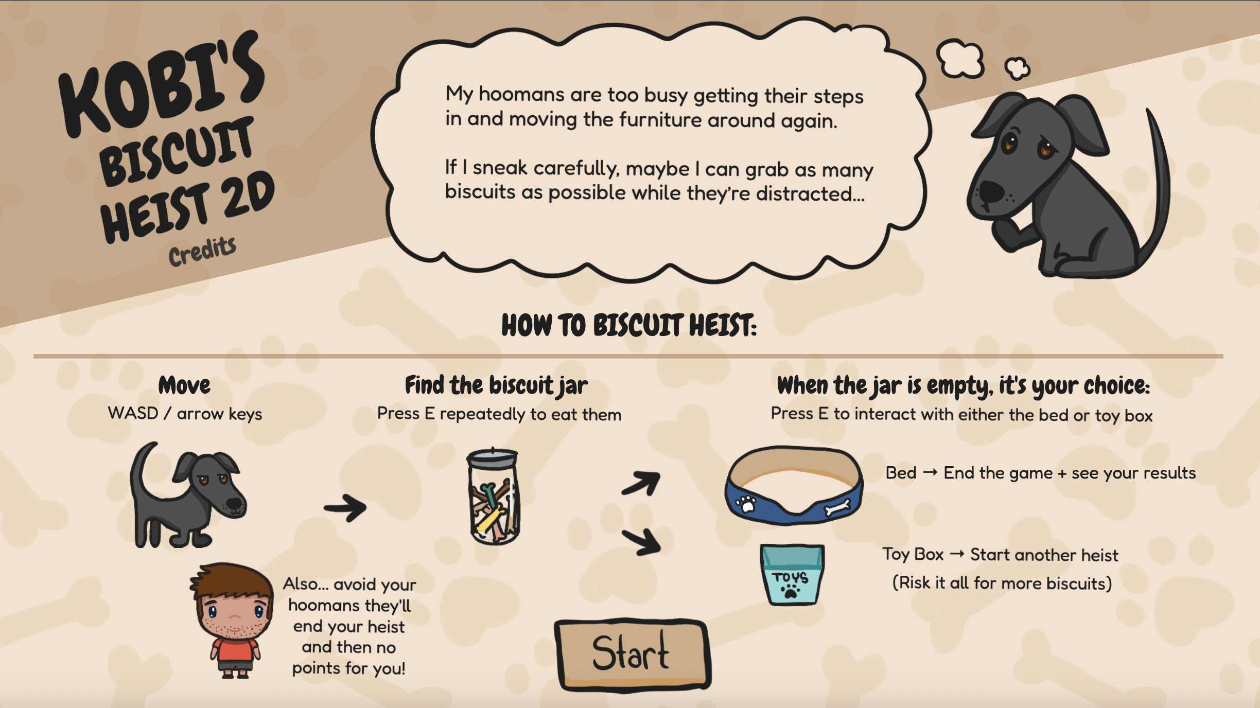 The theme is “Risk it for the biscuit” and that’s exactly what the game is about! You play as Kobi the dog, sneaking around the house to eat biscuits from the jar. Each time you finish a jar, you have a choice: risk it by going for another heist, or bank what you’ve earned by going to bed. Push your luck too far and the humans will catch you... but the bigger the risk, the more biscuits you can grab!