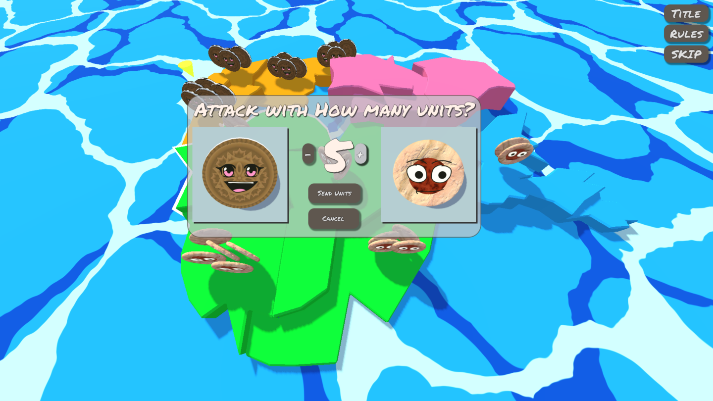 I attempted to get many of the board game Risk's mechanics into a game about cookies (biscuits to my British buds) going to battle. I did what I usually do and was as literal as possible...