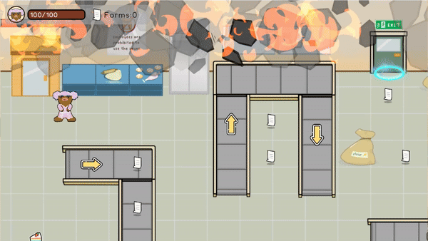 The setting and art for this game is hilarious. I love the HR lady slowly burning alive. The gameplay concept is pretty interesting, but most of the cakes don't seem to be worth the risk. But I do like how in some areas you can choose to ride the conveyor belt, or walk a riskier path for more forms. Overall, good job.