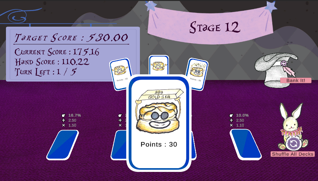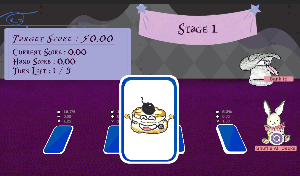 You begin with 4 identical decks, each holding tasty 10-point biscuits… and one bomb biscuit. Each stage gives you 3 turns: draw as many cards as you dare, bank them to score, or push your luck for bigger gains. But beware—draw a bomb before banking, and you lose everything that turn!