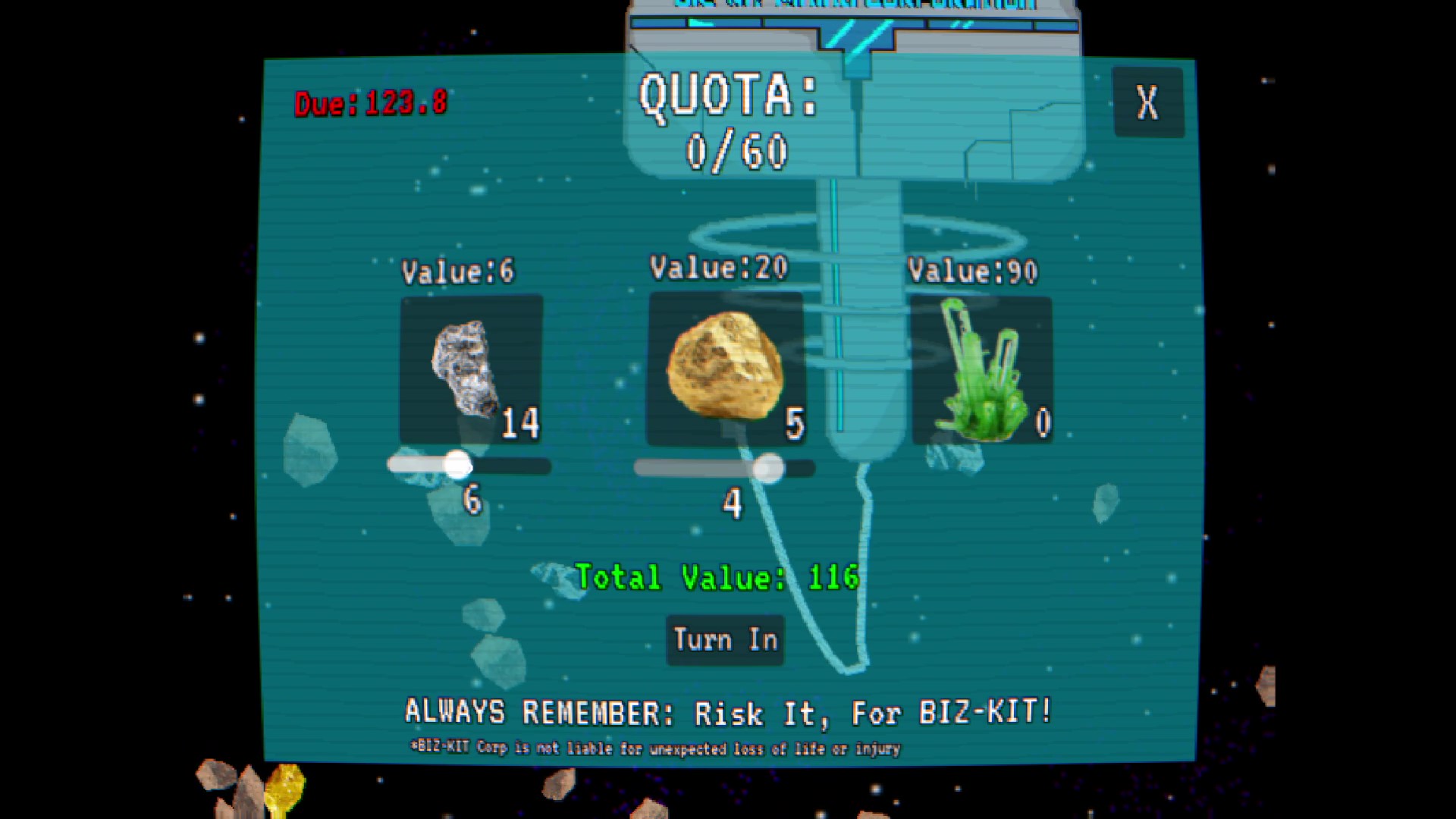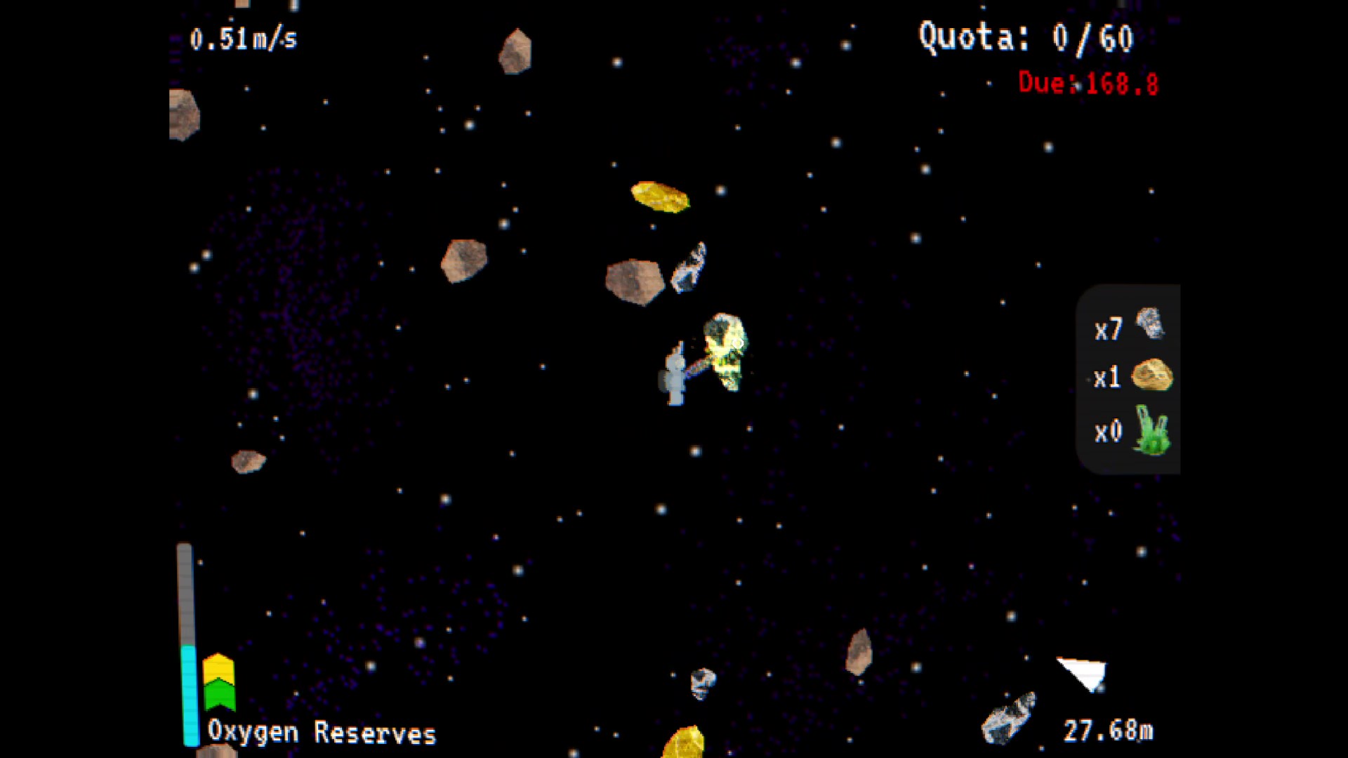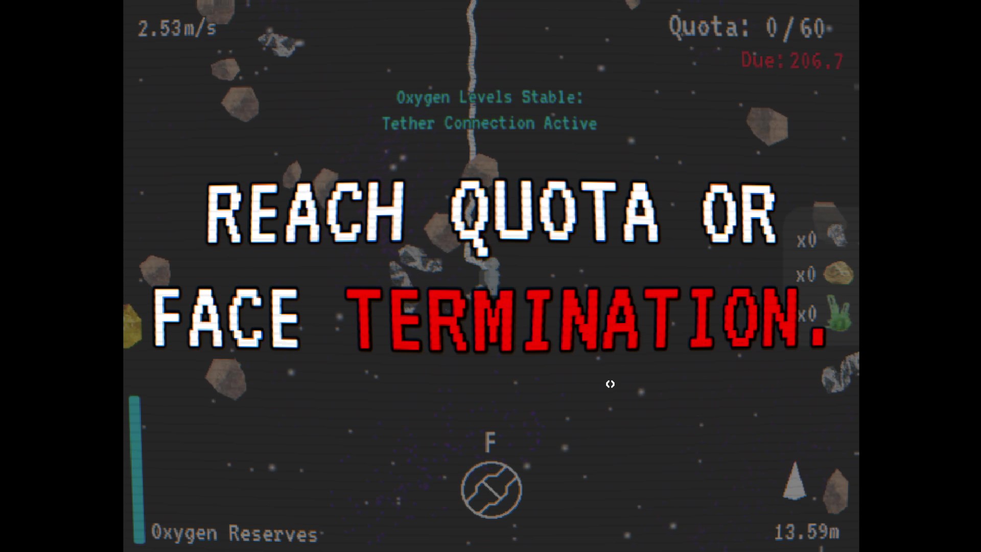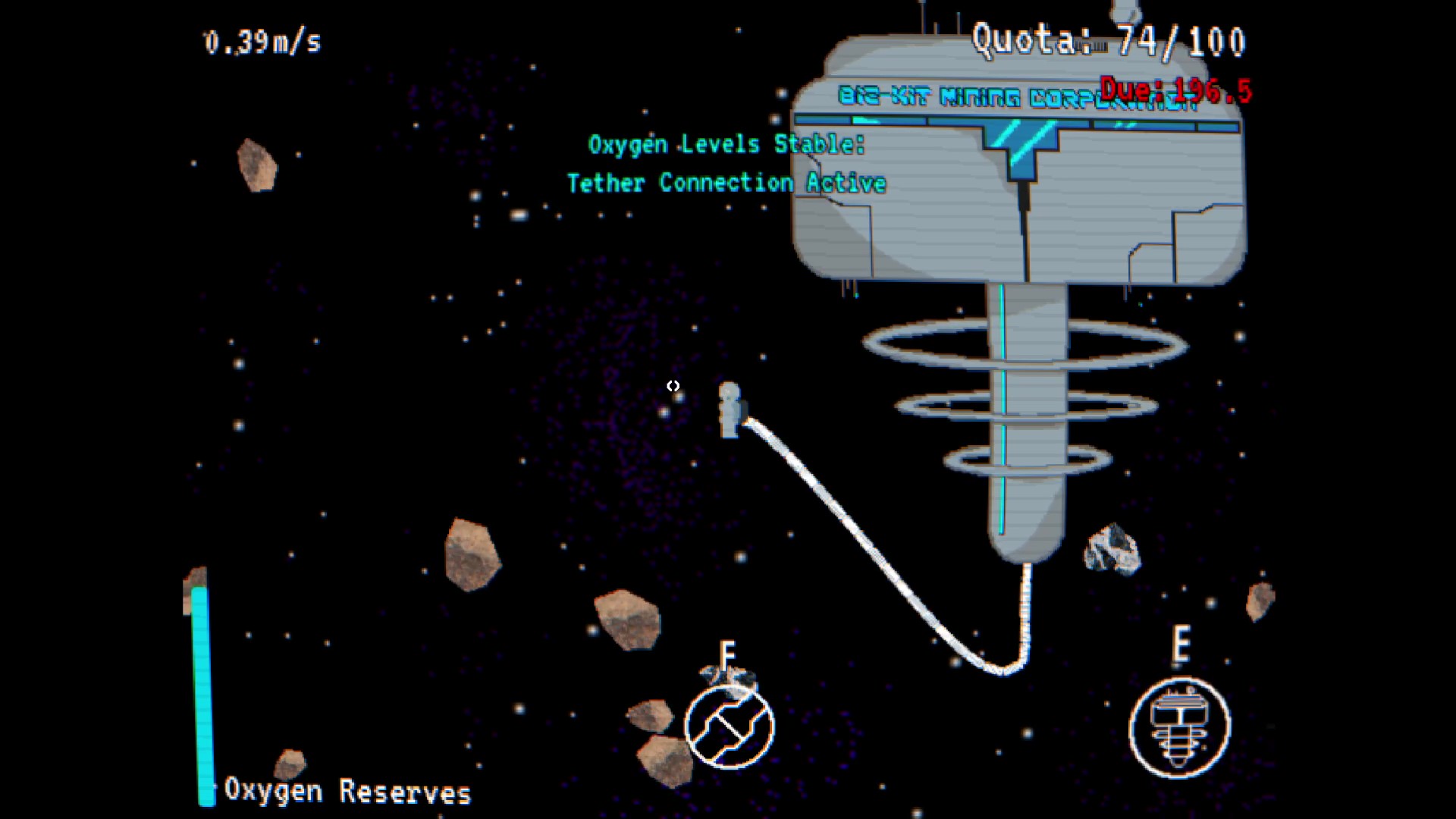 The player works for BIZ-KIT Corp, a corrupt mining company with strict and endless quotas. With limited oxygen away from their space station, players will need to make increasingly risky trips into the asteroid belt in order to keep up with BIZ-KIT's demand. Failure means certain death.