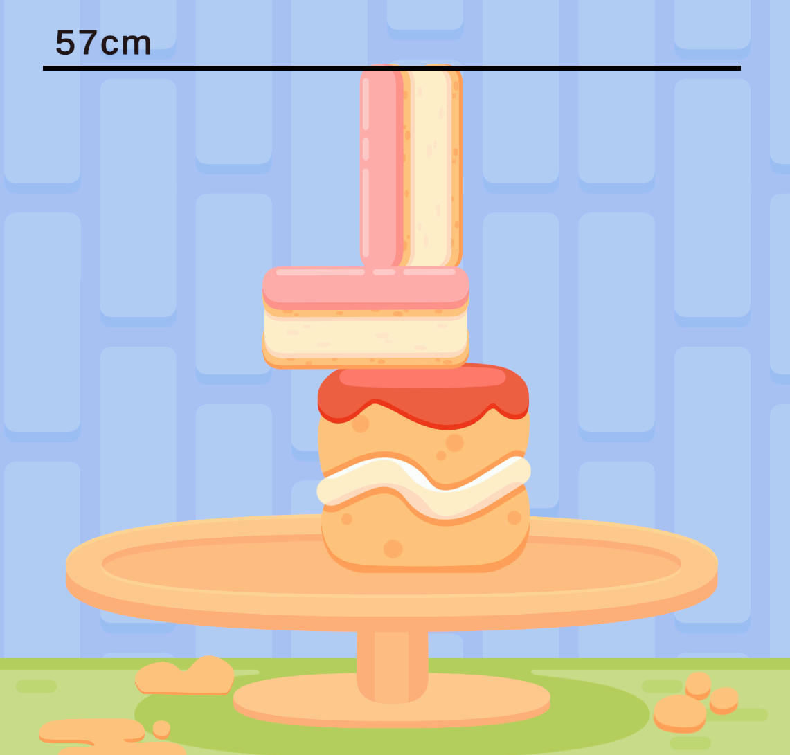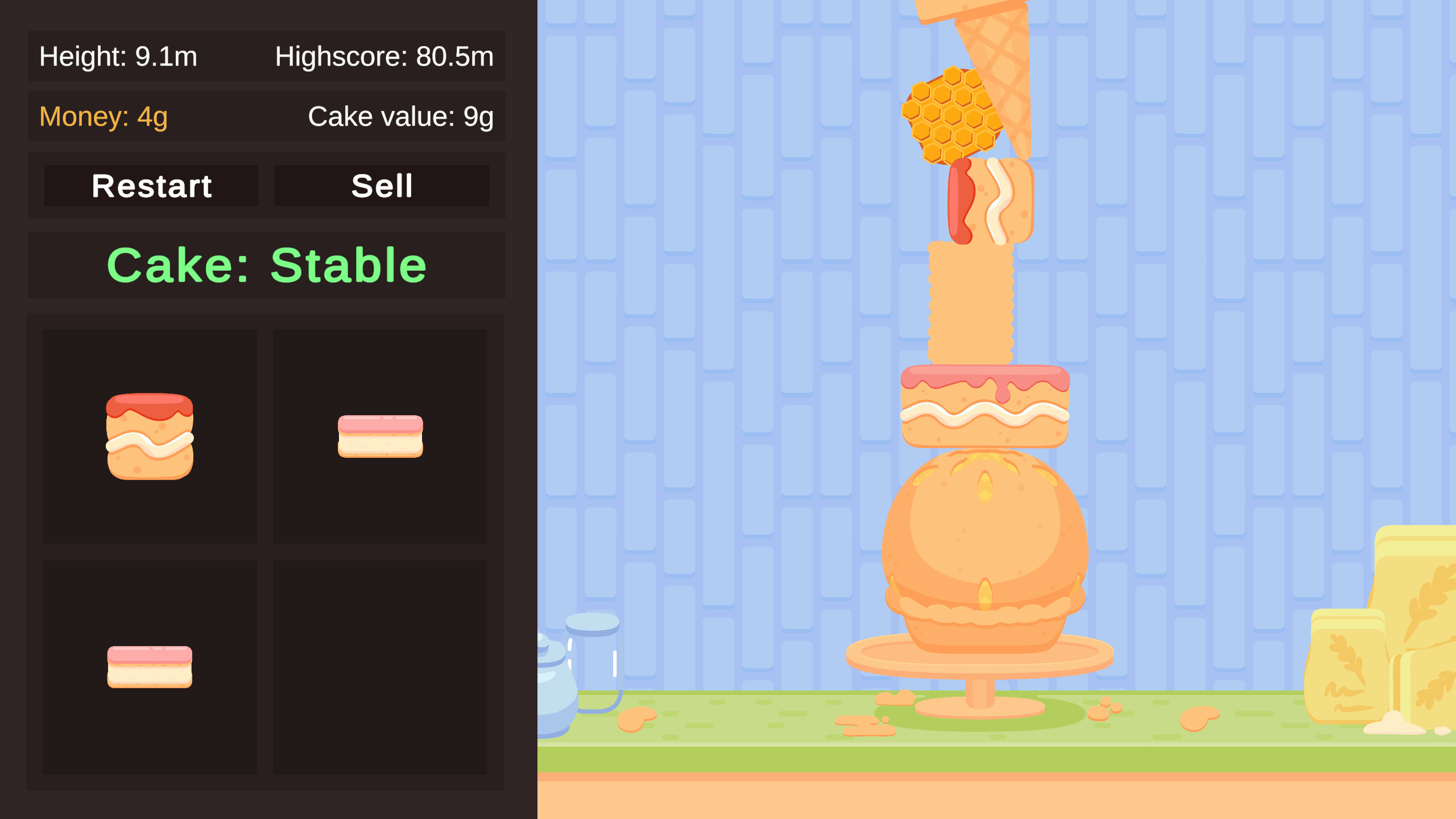 Really fun game and kinda low-key addicting, I think you could 100% turn this into something. just needs some fun music and sound effects and a little game feel, and I think you have something that could really do well. I think look at something like suika game and how they do their game feel, add some cute faces/ personality to the cakes and its golden. ^-^
