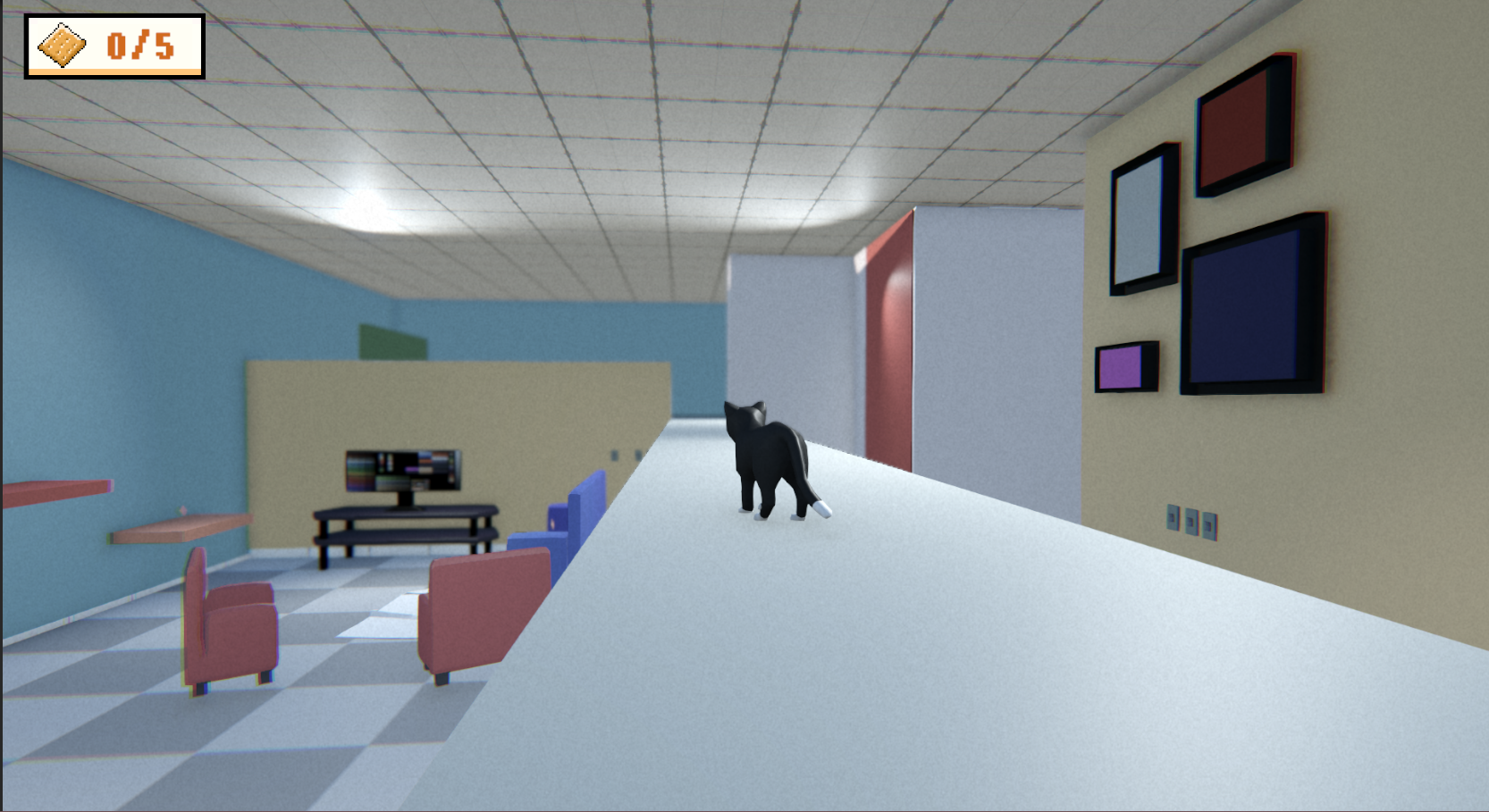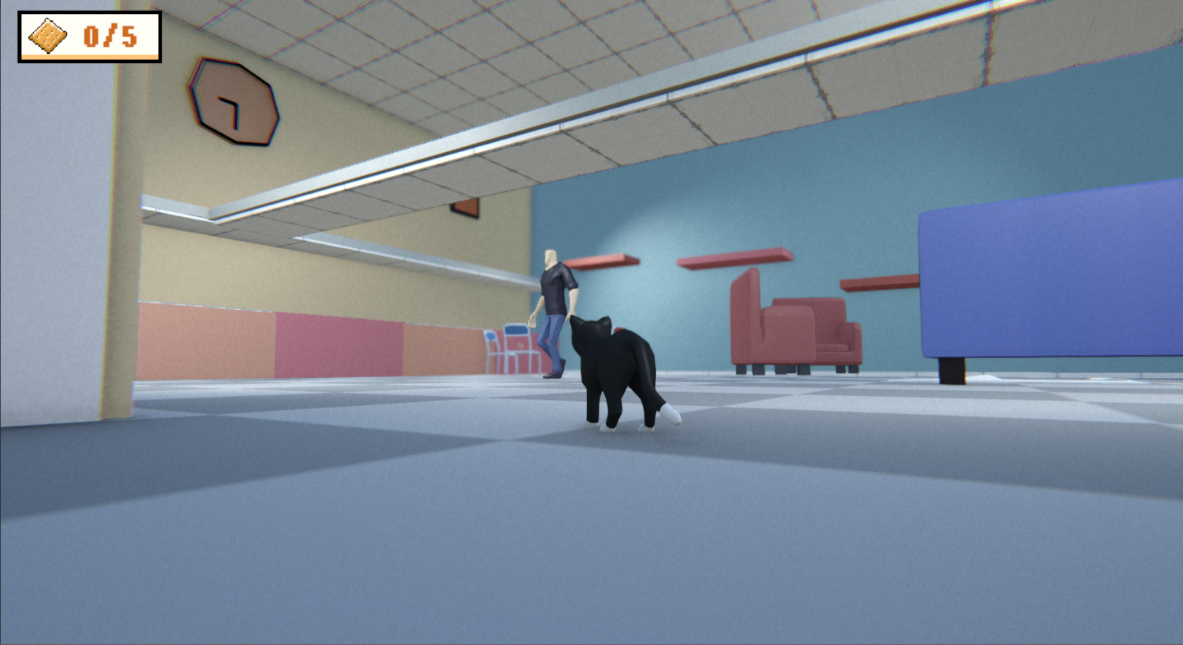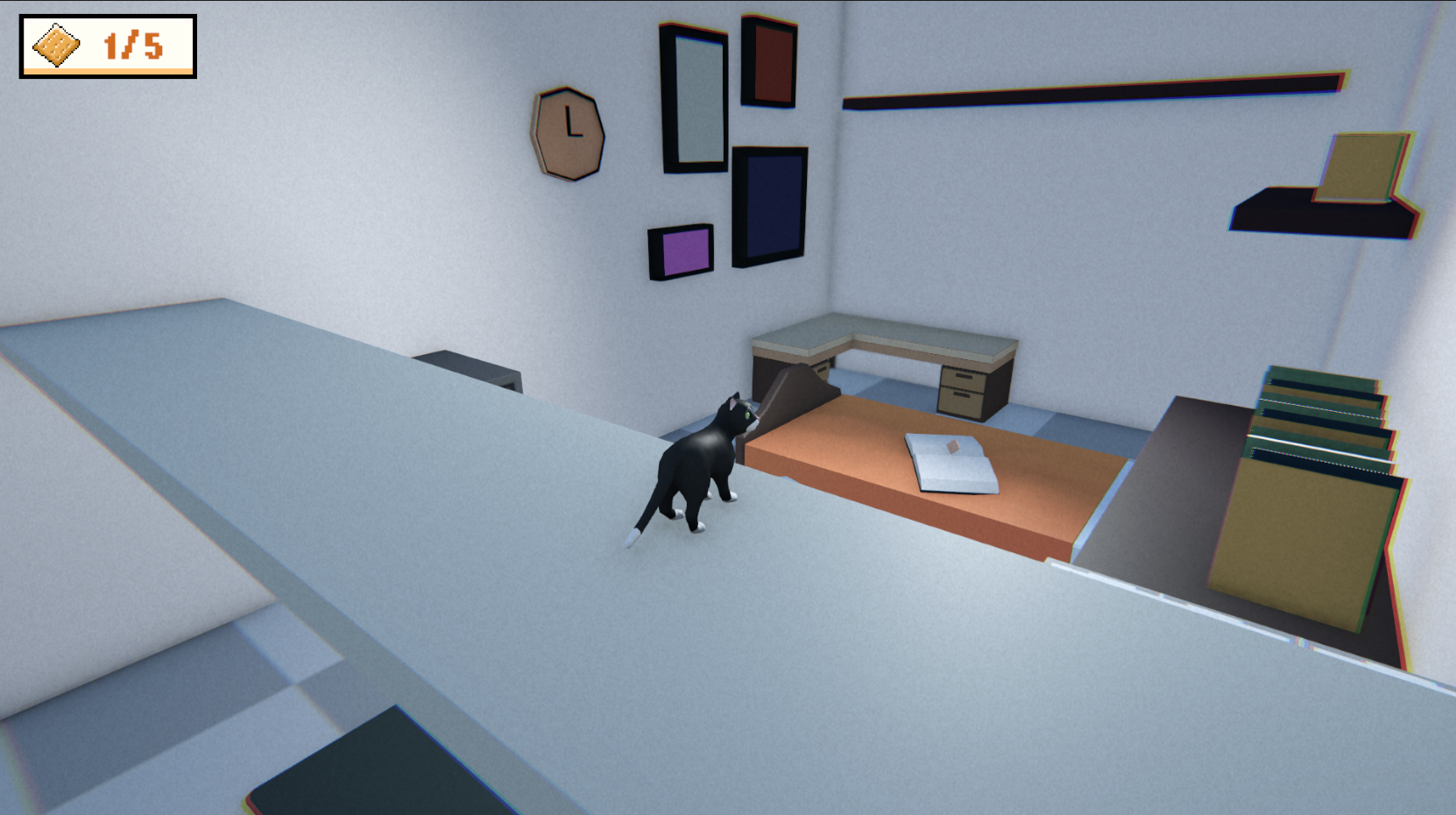 Very cute game, absolutely loved the vibe of it. The music helped a lot in making it feel like a more relaxing and comfortable experience despite the risk continuously being the owner spotting you. Managed to complete all 4 levels. Only real gripe I had was with the camera which kept switching angles if you were to hit the ceiling or stay too close to a wall which made it a headache to get to some of the biscuits in some cases. Also, check the collision period of said biscuits as it was kind of difficult to grab even when standing literally in it and I could get more than 1 at times which had me complete levels more easily than it should've been. Nonetheless, congrats on your game!
