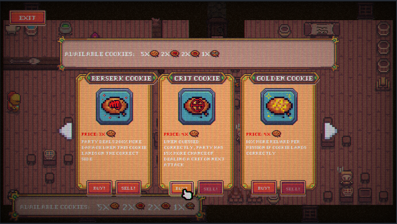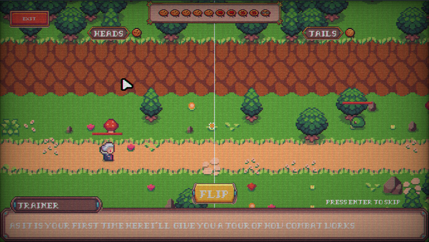 I wish there was a little more showing than telling when it comes to the battle system and what everything does. I understand cookies do something but I can’t tell what each does exactly and sometimes when I succeed on a flip it just seems like nothing happened. Still a very charming game that fits the theme very well. Great job!