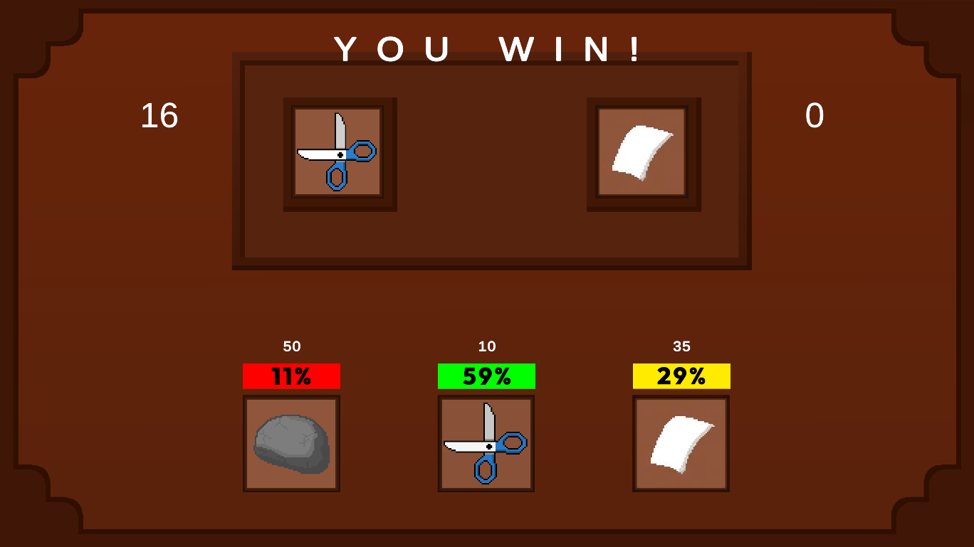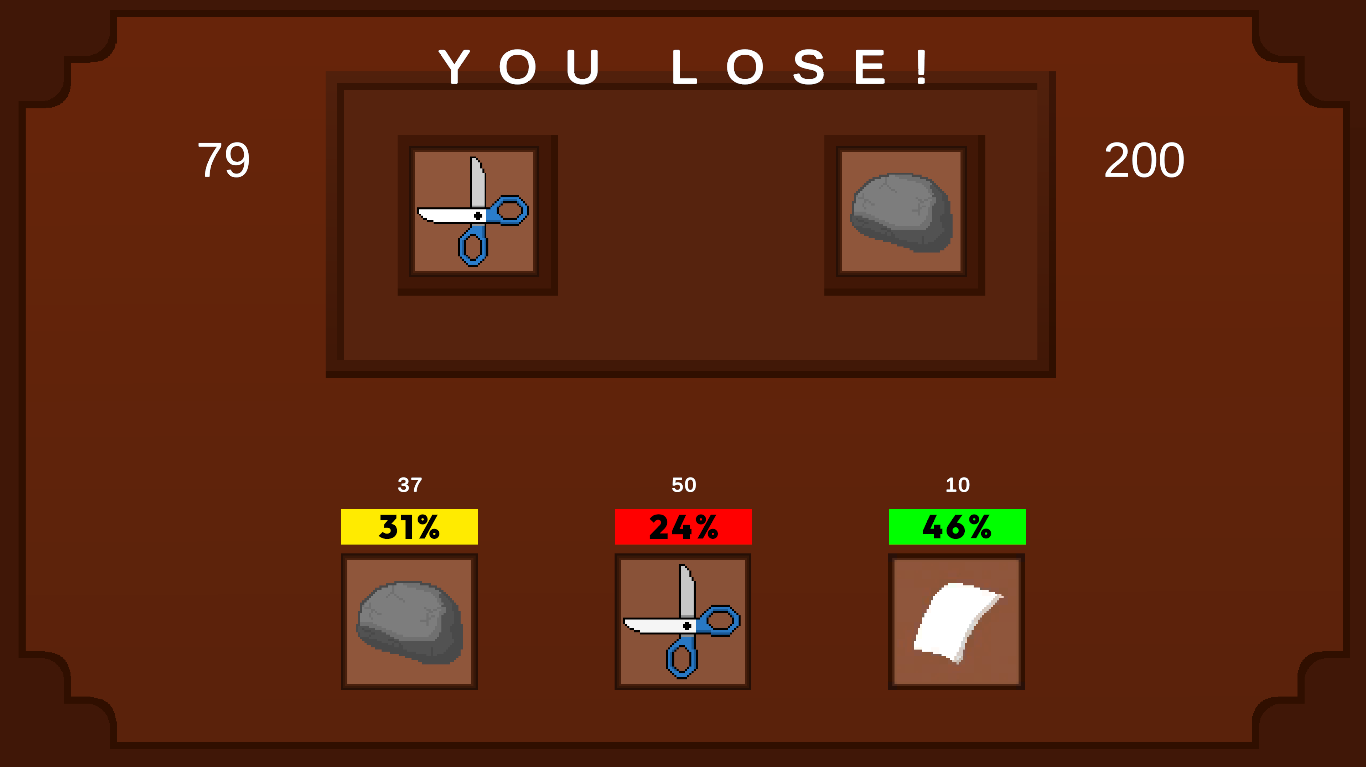Test the game a lot to make it addicting for you and to fix up any exploits the user can have to beat it. Also, try to extend beyond just rock paper scissors for the idea. There's another game in the jam called Rock Paper Scissors Roulette that also includes Rock Paper Scissors but brings in more depth so that the player focuses both on trying to guess right in rock paper scissors and the amount of bullets in the chamber and where. That could be a good source of inspiration to see how concepts can be expanded upon beyond a simple idea.