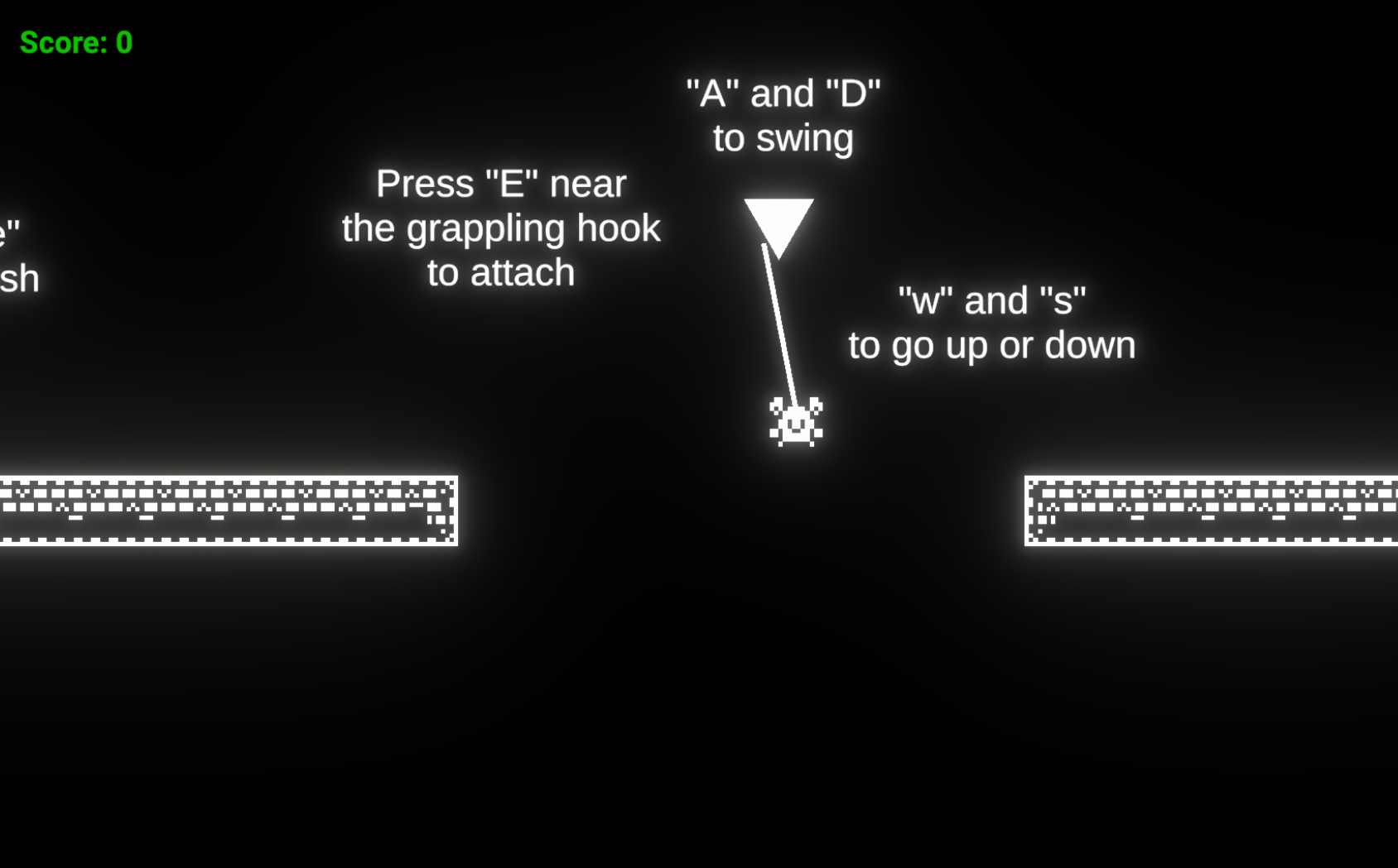 The grapple mechanic was great! I also really like how the game looks, and overall had a lot of fun. I did get stuck on one side of the map, but maybe there was a way to get out that I didn't realize. I also recommend changing the key for the graple into something other than E since it's a bit hard to press E while moving with A and D. Either way, this was a fun game.