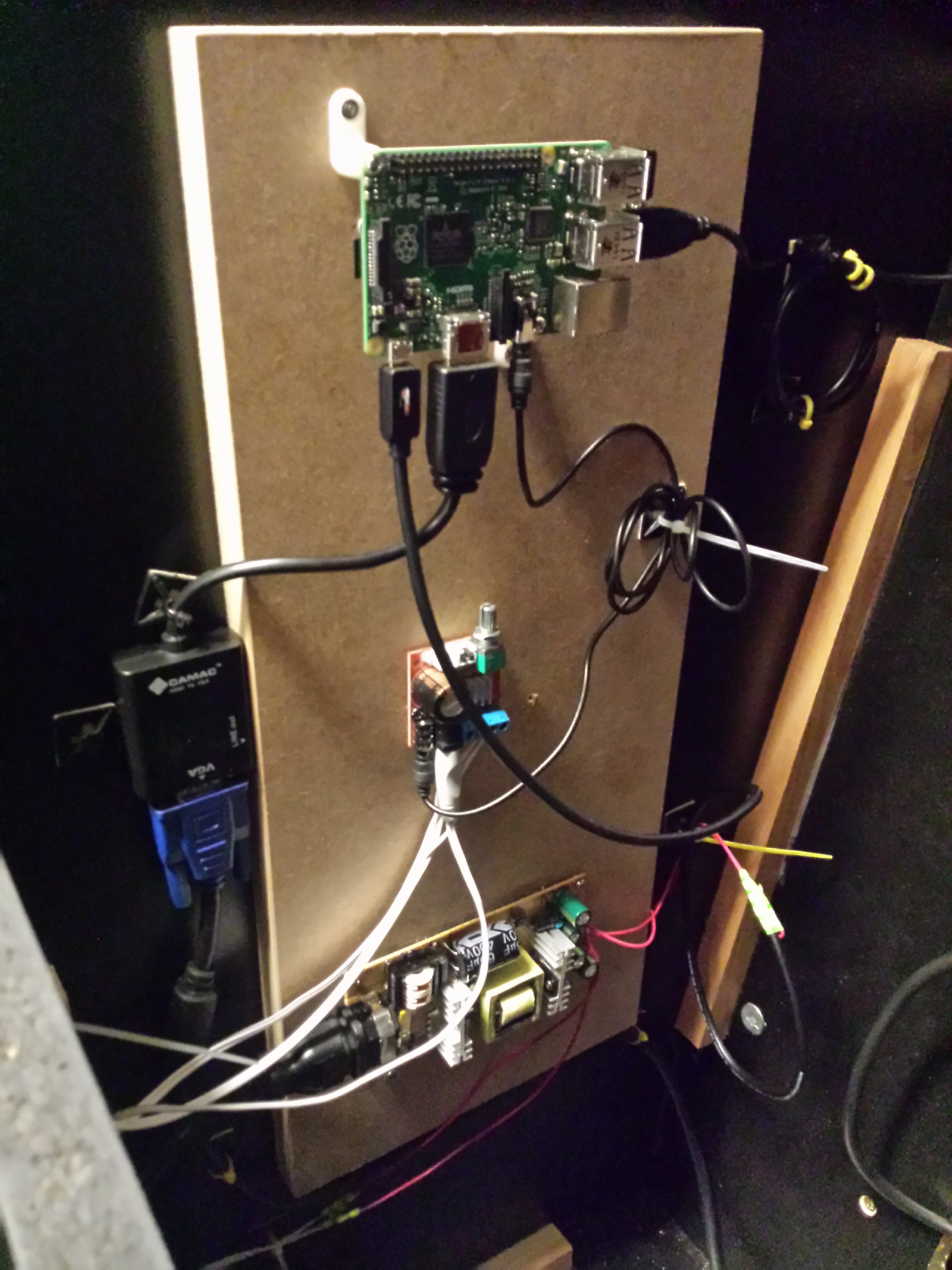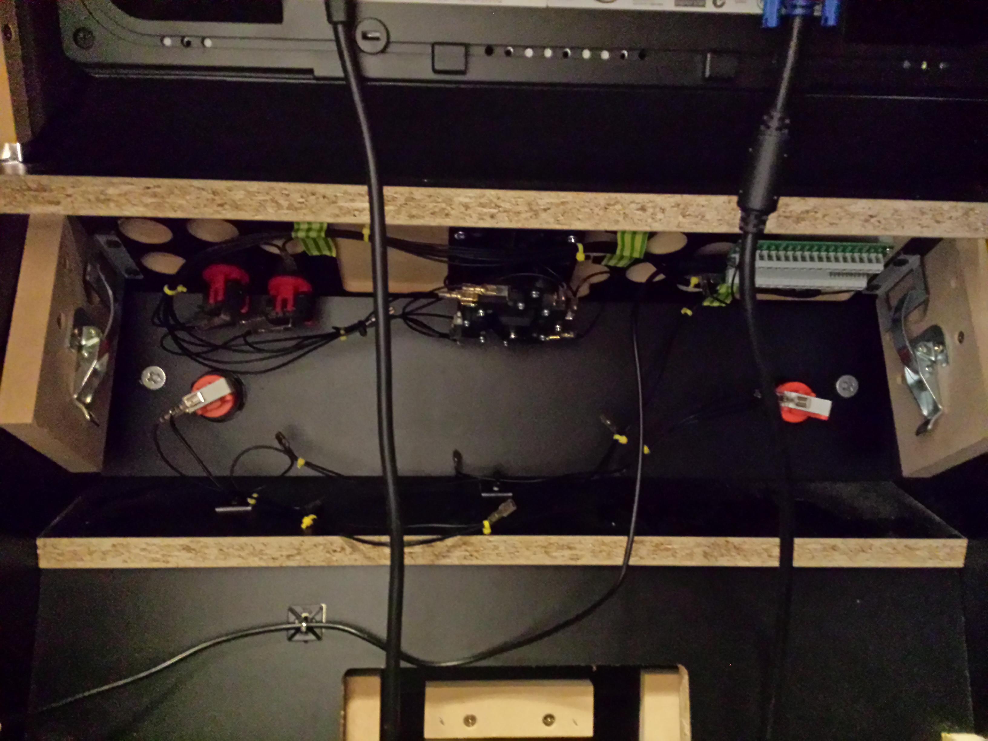 The underside of the control panel and the bottom of the mounted LCD. Uses standard arcade controls (Happ brand in this case) and an I-PAC2 to map these onto keyboard presses for convenience.