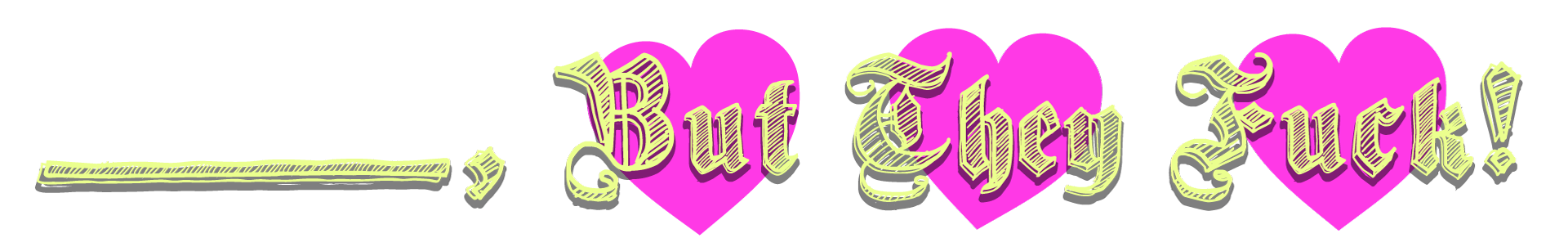 The "But They Fuck" jam. Your chance to take something wholesome and pure and bring it down to our level by injecting a healthy does of degenerate sexuality. Basically, create something that can be best described as "[something], but they fuck."
