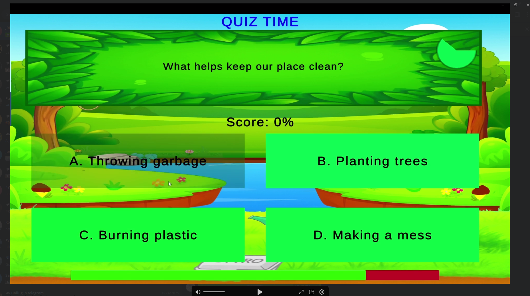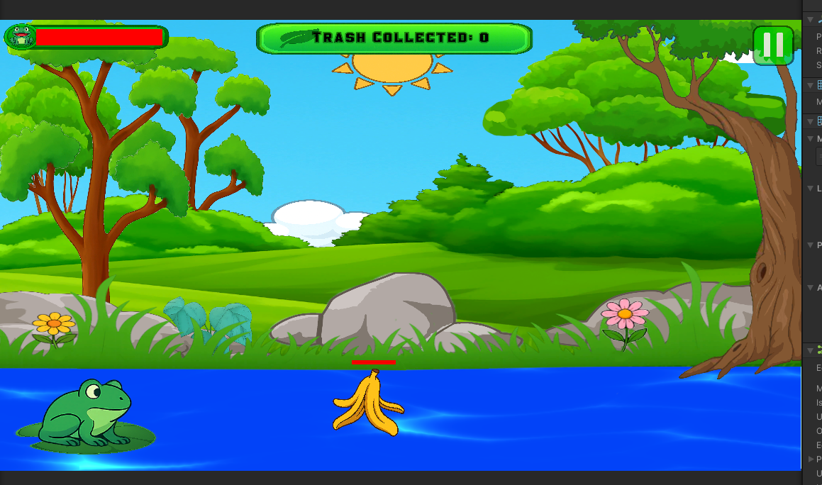 Eco Frog is a game with an important message. As a frog, your mission is to defend your home—the river—from enemies: the trash that pollutes it, such as banana peels, cans, and other garbage. Using your skills, you must clean up the river and segregate the trash in the trash bins to restore its beauty and health.