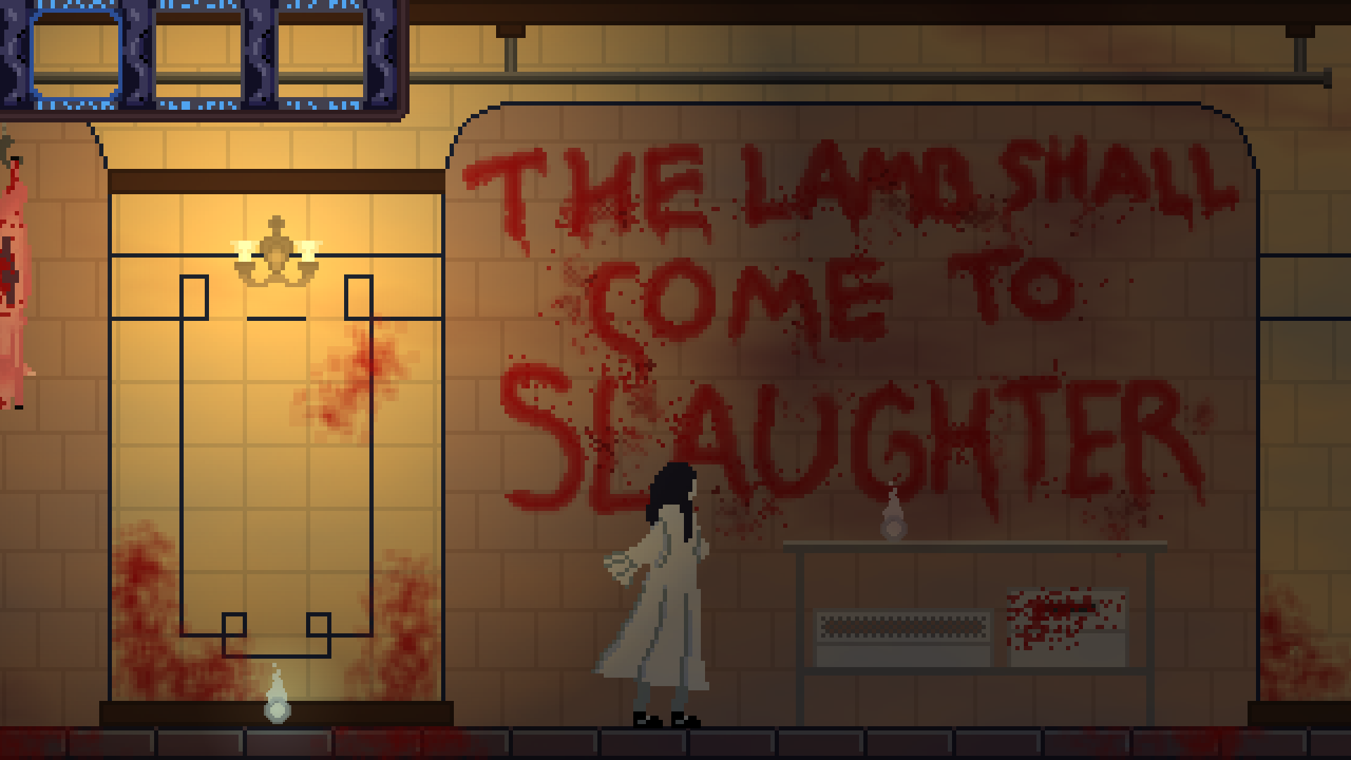 Pixelated blood and animal corpses, dismemberment and disturbing themes.