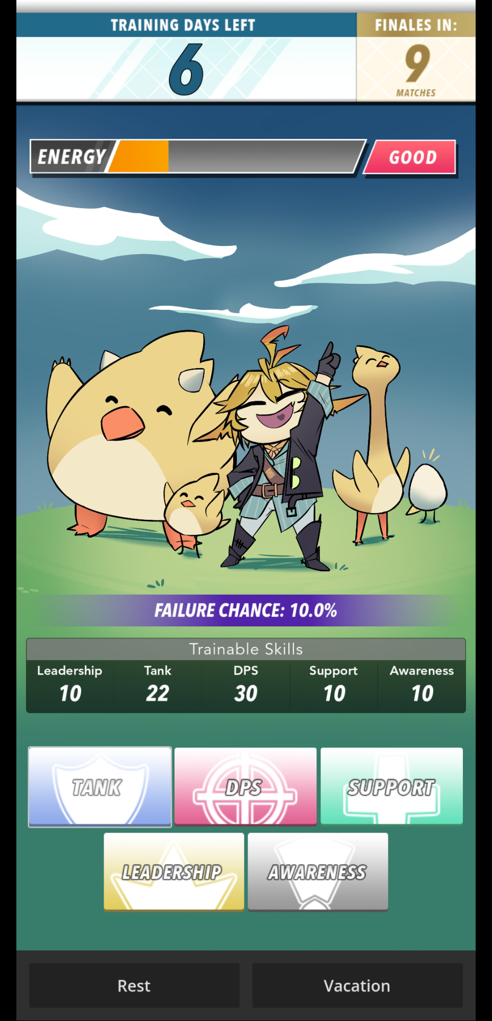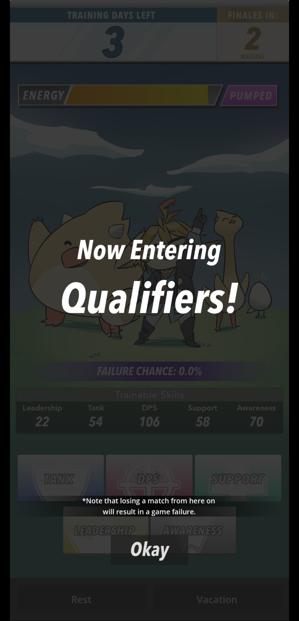 Thank you for playing and your feedback! Thank you for pointing out failure chance. I've updated the page description to talk more about it as being related to training as opposed to the potential outcome of a match (although thats an interesting idea in and of itself!)