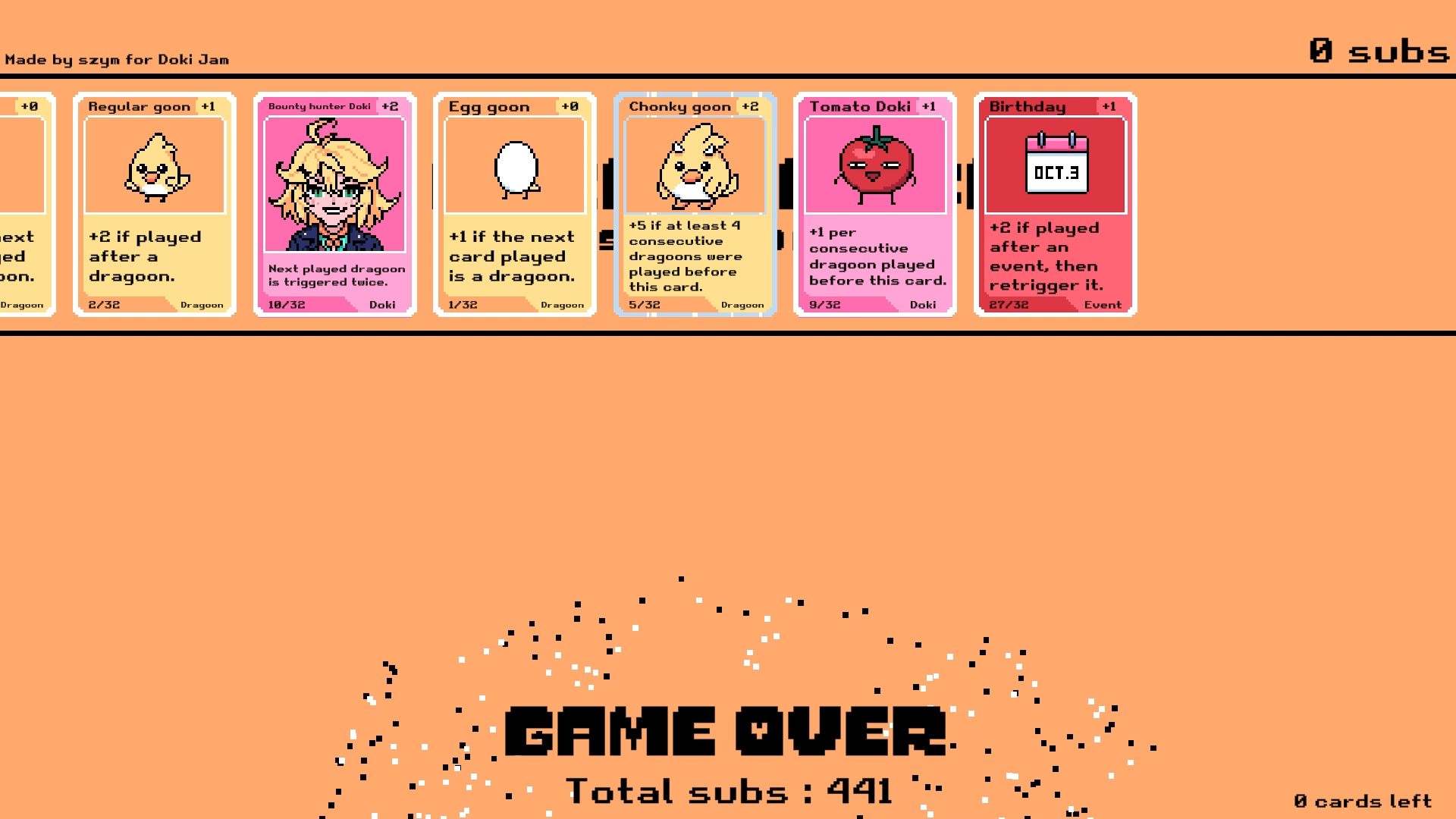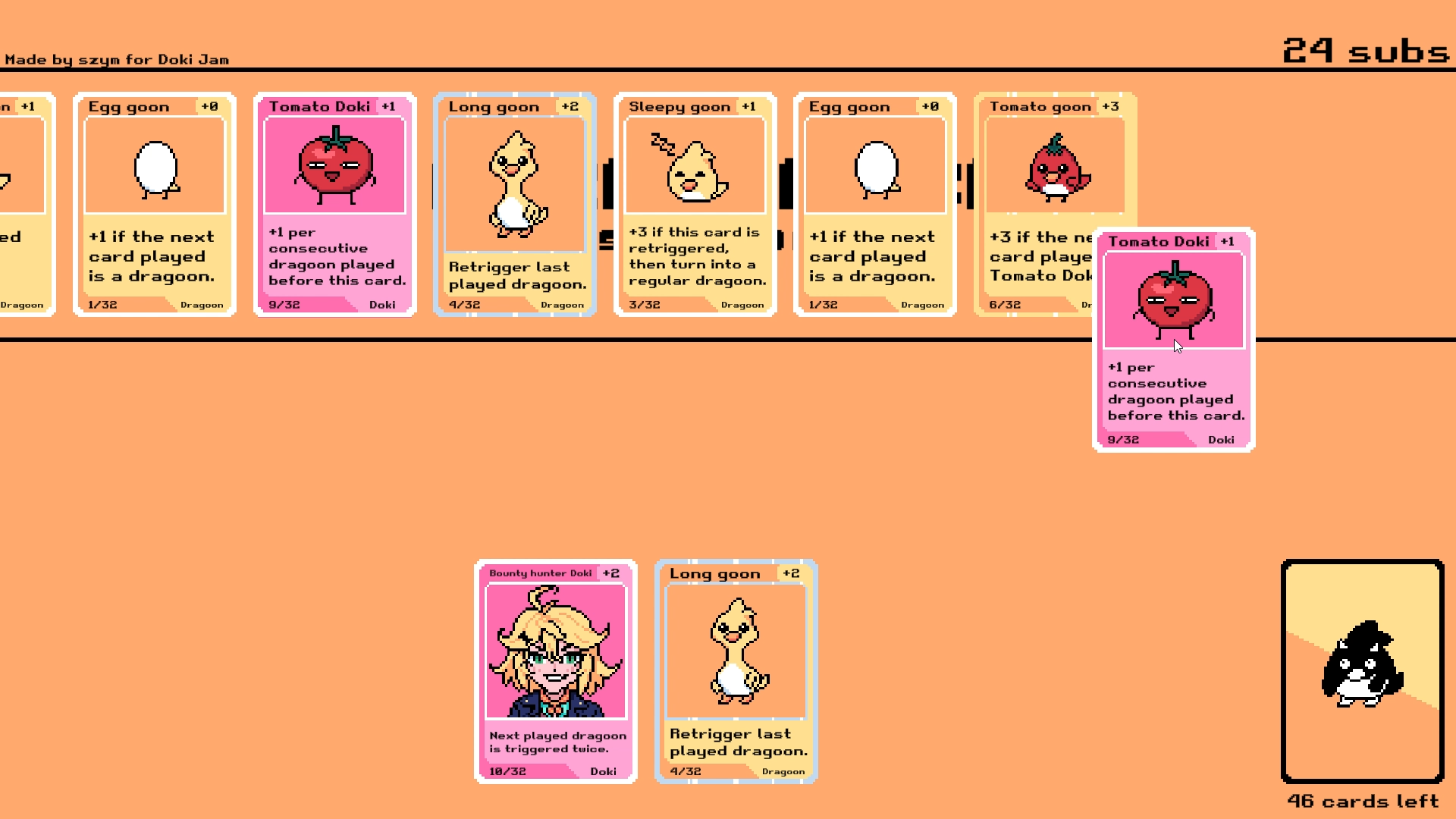A really cool deck builder! There's so many different effects, and you somehow managed to make it chain together so well! Gameplay wise, it was really fun too. Nothing really at stake, just trying to amass more subs so we ca open more cards. Simple goal, but such in-depth card game mechanics!