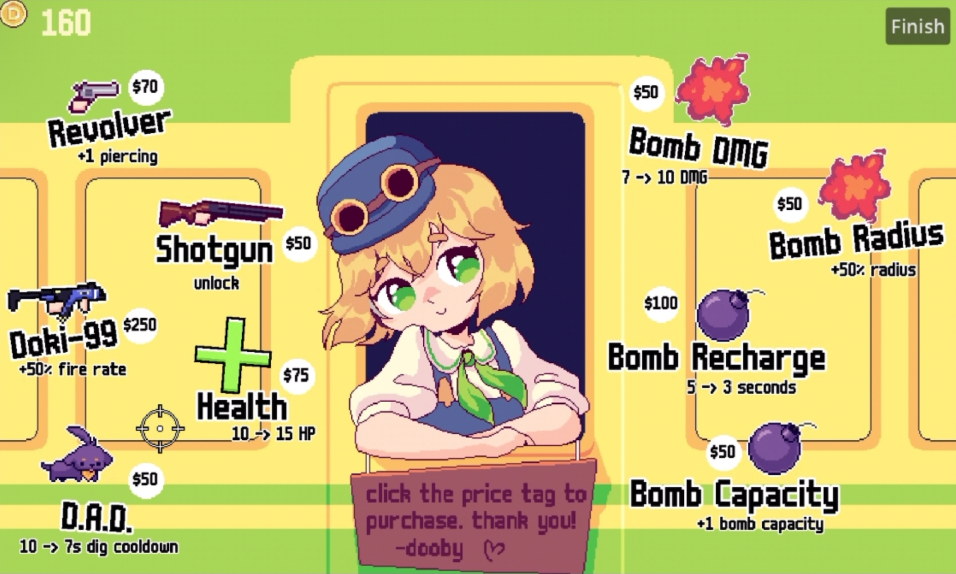 I also like the chain combo meter, the upgrades shop (that Dooby art is adorable!) and the bomb chaining. Solid combo of game mechanics to make a great action game!