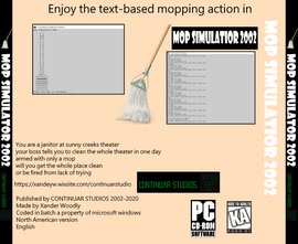 You are a janitor at sunny creeks theater. Your boss tells you to clean the whole theater in one day. Armed with only a mop. Will you get the whole place clean. Or be fired from lack of trying. Action packed, turn-based, text-based game pla...