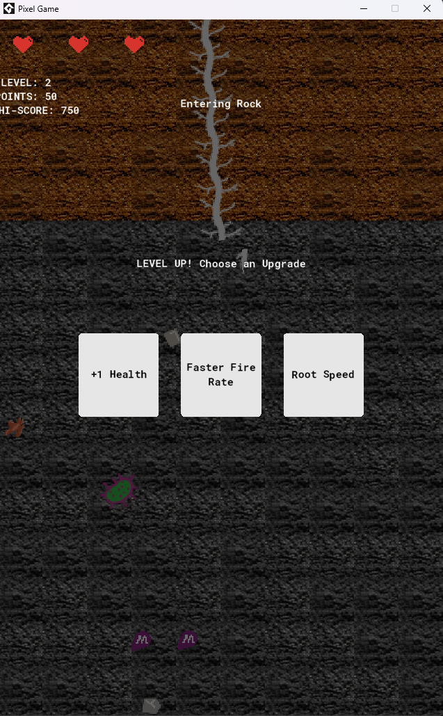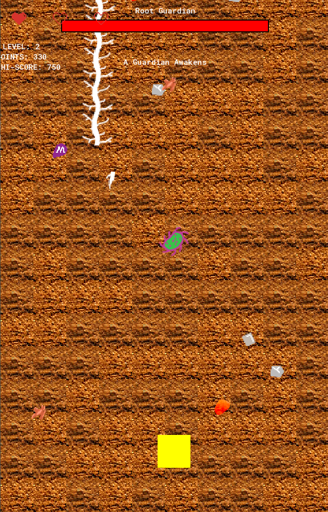 Really cool theme interpretation! At least in my view, the game might feel a bit nicer if the handling on the root was a bit more responsive. Other than that, I really liked how each run felt a bit different because of getting to choose upgrades. I liked the fire rate one a lot, especially because it helped deal with the boss attacks!