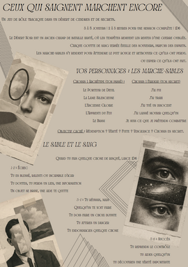 Pour 3 à 5 joueurs | Parties de 2 à 3 heures | 1D6 seulement | Un jeu de rôle poétique et tragique dans un désert hanté, où chaque blessure révèle une vérité. Le sable se souvient. Le sang appelle. Lancez un D6 pour affronter les t...
