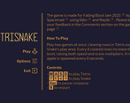 So yeah, that is the twist of Tetrisnake. And by the way, the game is trivial (obviously) if you ask someone to help you, e.g. you both play the game, and each one controls and watches its own game. This is cheating, just so you know :D