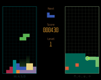 Very thoughtfully implemented. There's a whole bunch of expectations this is subverting to good effect. Initial expectation was for something more chaotic, but we're greeted with calming music and colors, along with a very composed interface. I expected an insta-drop button in Tetris, but then struggled to think of a logical place for it, and as the rhythm of the gameplay settled in, I realized it was unnecessary—it feels like it's more about positioning and waiting for both sub-games, more about controlling yourself to shift focus between the two contexts. (I also expected an instant-restart reminder/button onscreen on game over, but as the calm music played on, I felt my annoyance (at the surprise of the snake-crash) fade, giving me a chance settle more fully before starting the next round.)