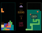 The slowly-expanding snake-area is clever too -- it seems like snake would be much easier to ignore with a full-sized board to start, and the difference between the two axes (vertical being so short) makes it easier to fail fast in the beginning, teaching you early that mistakes with the snake are much more dangerous than those with Tetris.