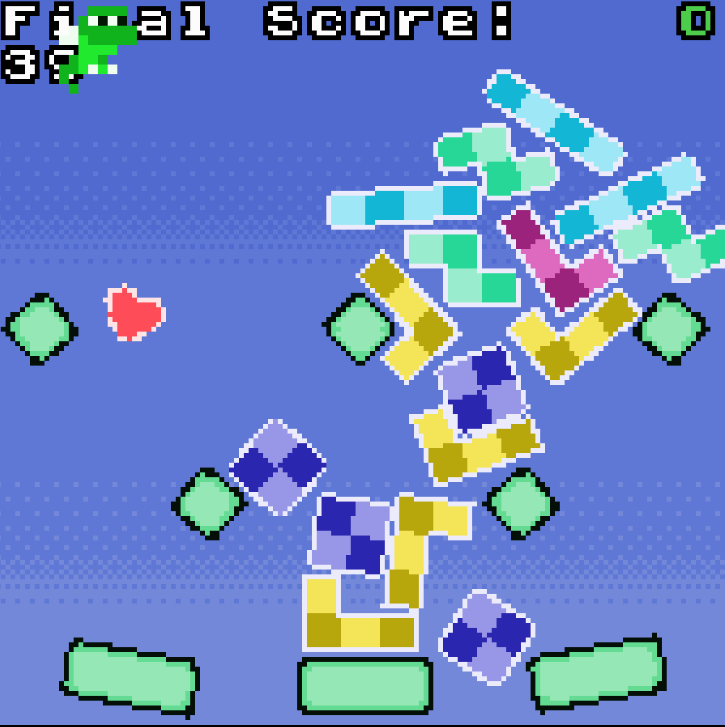 This is very cute! Also not sure how you stacked the blocks so well on the screenshots!! Did not manage to get over 50 in score anywhere, but I think the core concept is very fun. The biggest scores I got happened when I managed to get a piece stuck covering a larger gap, but I didn’t feel like I could do that consistently enough, although I will admit that’s probably a skill issue on my part. (Also on the third level I got everything covered in the middle, but then the piece holding it all got bumped and I lost a bunch of pieces, oops)