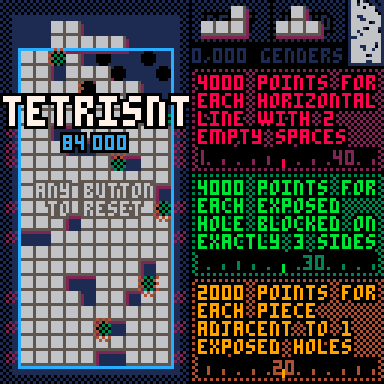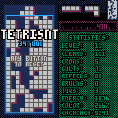 Pretty good games! MATCHTRISNT was pretty satisfying once I got used to it. Having some Tetris skills still helps with organising. Really good combo of Tetris and block matching games. Didn't play SCORETRISNT much, my highest score was dropping all the pieces in the middle and somehow ended up with a very large score. Really cool, excellent job!