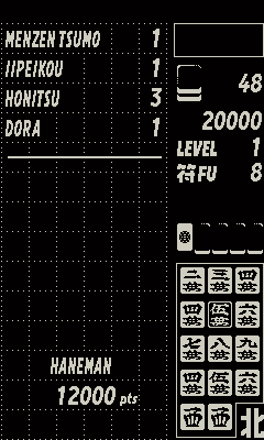 This game is quite challenging! I'll need a fair bit more practice to start building more than just menzen tsumo, tanyao, etc.. I found that receiving tiles in fixed triplets sometimes makes it tricky to access the center tile, especially with only straight-line melding to work with. However, having access to a Hold function seems very useful; I'll have to practice using it more effectively.