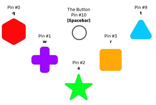 For this year's jam, we're building a Flipbox controller based around 5 toggle switches. Each switch will be mapped to a key, with the switch's `Down` position mapping to holding down that key - `q`, `w`, `e`, `r`, and `t` . To make menus easier, we'll also have a single Lil' Button in the middle of the controller, though it's up to you whether this does anything beyond starting your game.