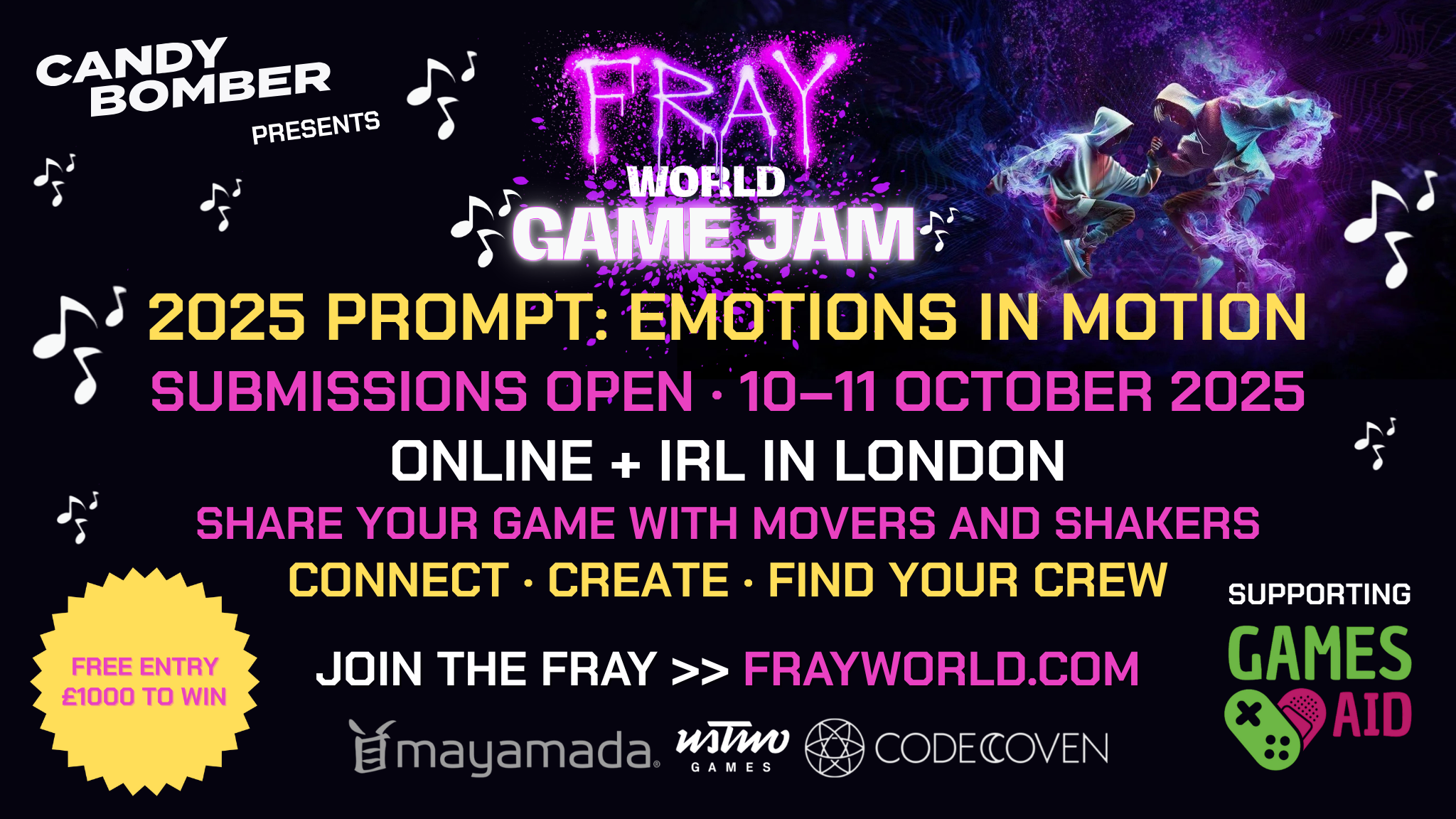 FRAY World 2025 is powered by CandyBomber in partnership with mayamada, ustwogames, Code Coven, and friends across the creative community. The IRL events are supporting GamesAid.