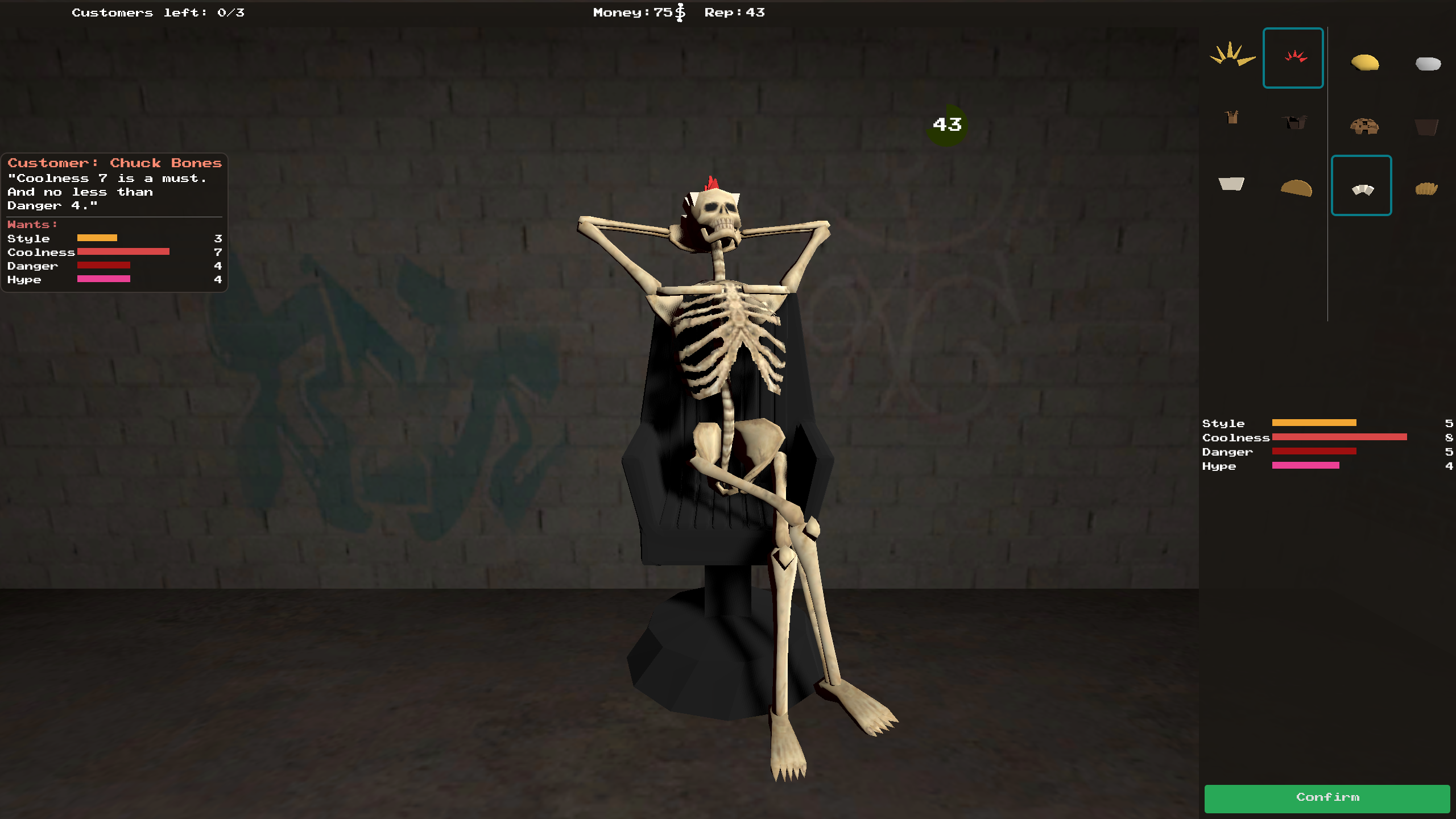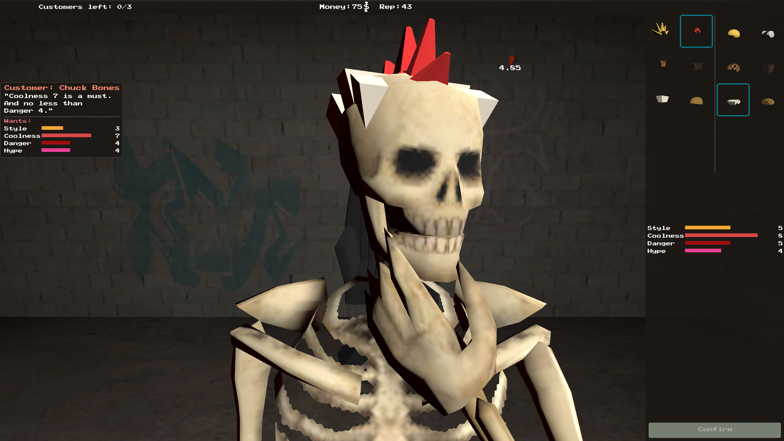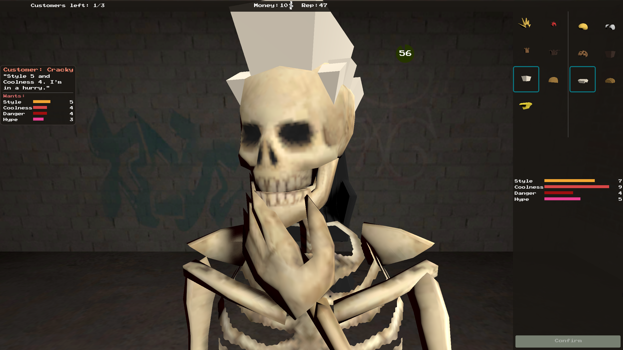 Skeleton phonk got anoying after some time... Didnt understand point of reputation points. At first customer dialog feels misleading. It felt like wigs should be primarily chosen based on skeleton dialog, but actualy wigs should be chosen based on wants chart.