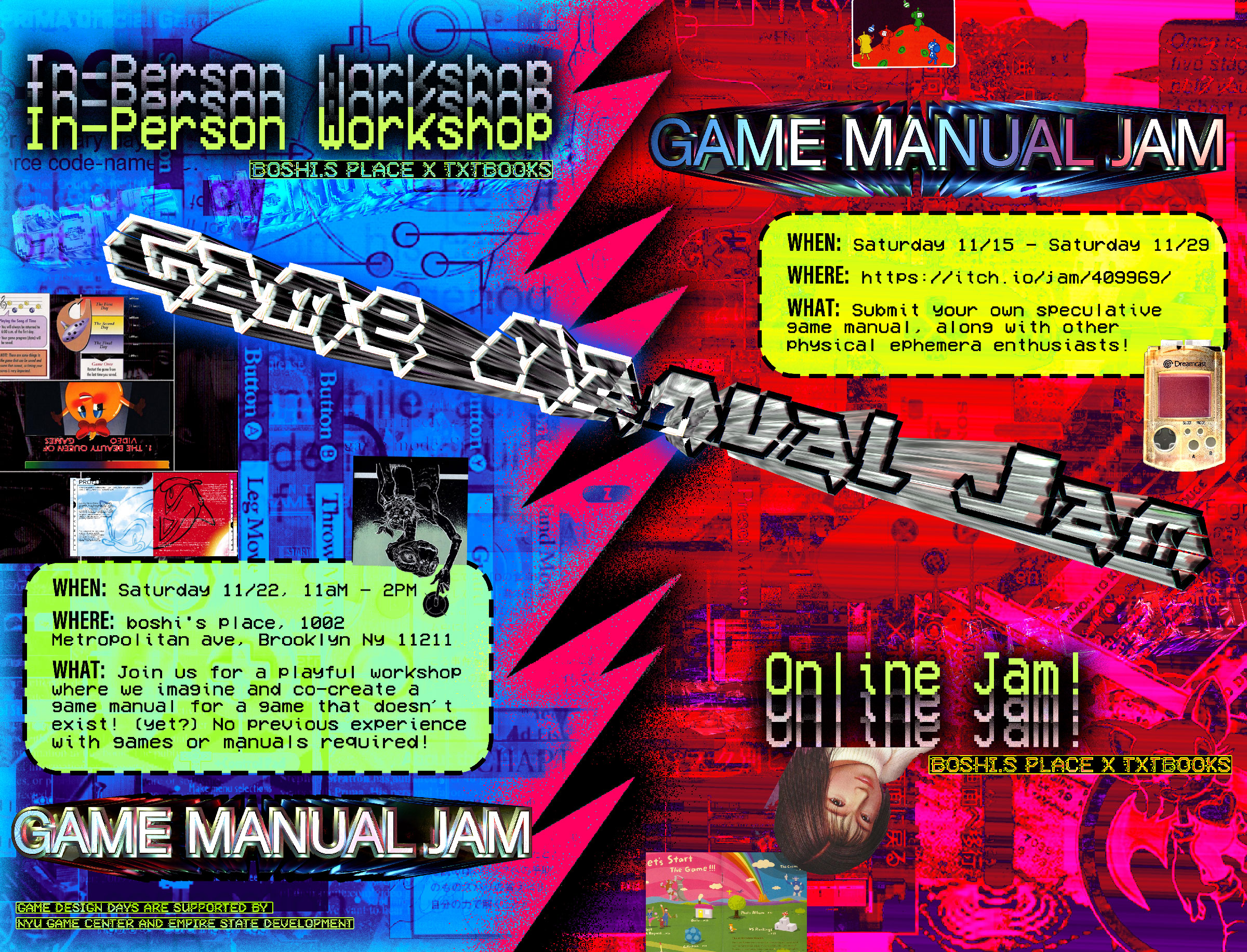 Introducing: the first annual Game Manual Jam! Hosted by boshi's place in collaboration with txtbooks and organized by hatimb00, mariopartygod, and spacelionz, as part of NYU's Game Design Days!