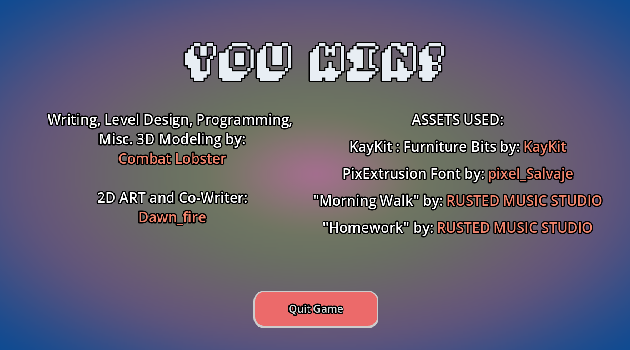 KayKit : Furniture Bits, PixExtrusion Font by pixel_Salvaje, the songs "Morning Walk" and "Homework" by RUSTED MUSIC STUDIO