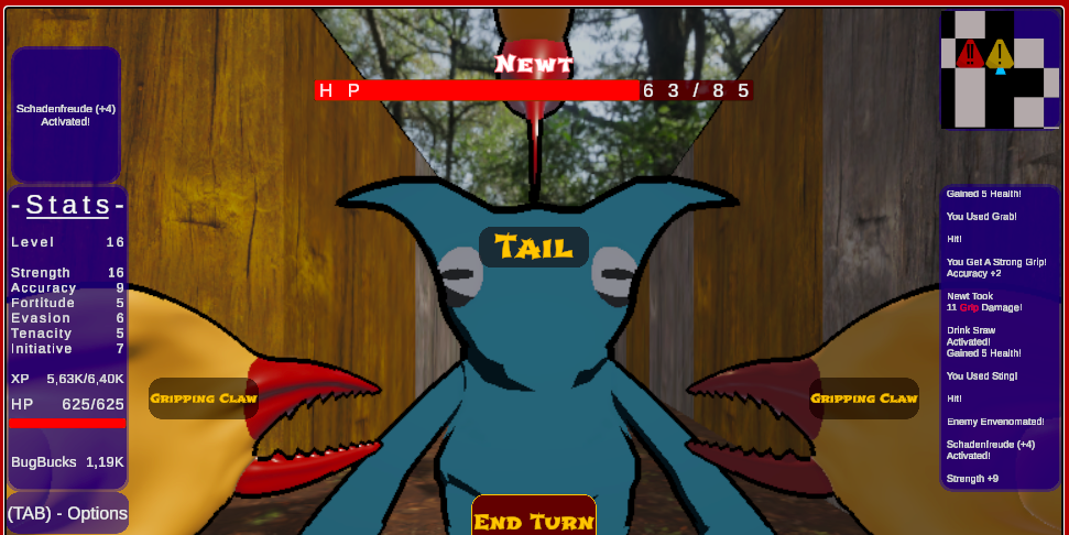 2) was unsure that it was a turn-based fighting system and tried finding the controls of how to attack with my pincers/ stinger - took me a while to just walk into the first guy hoping something would happen
