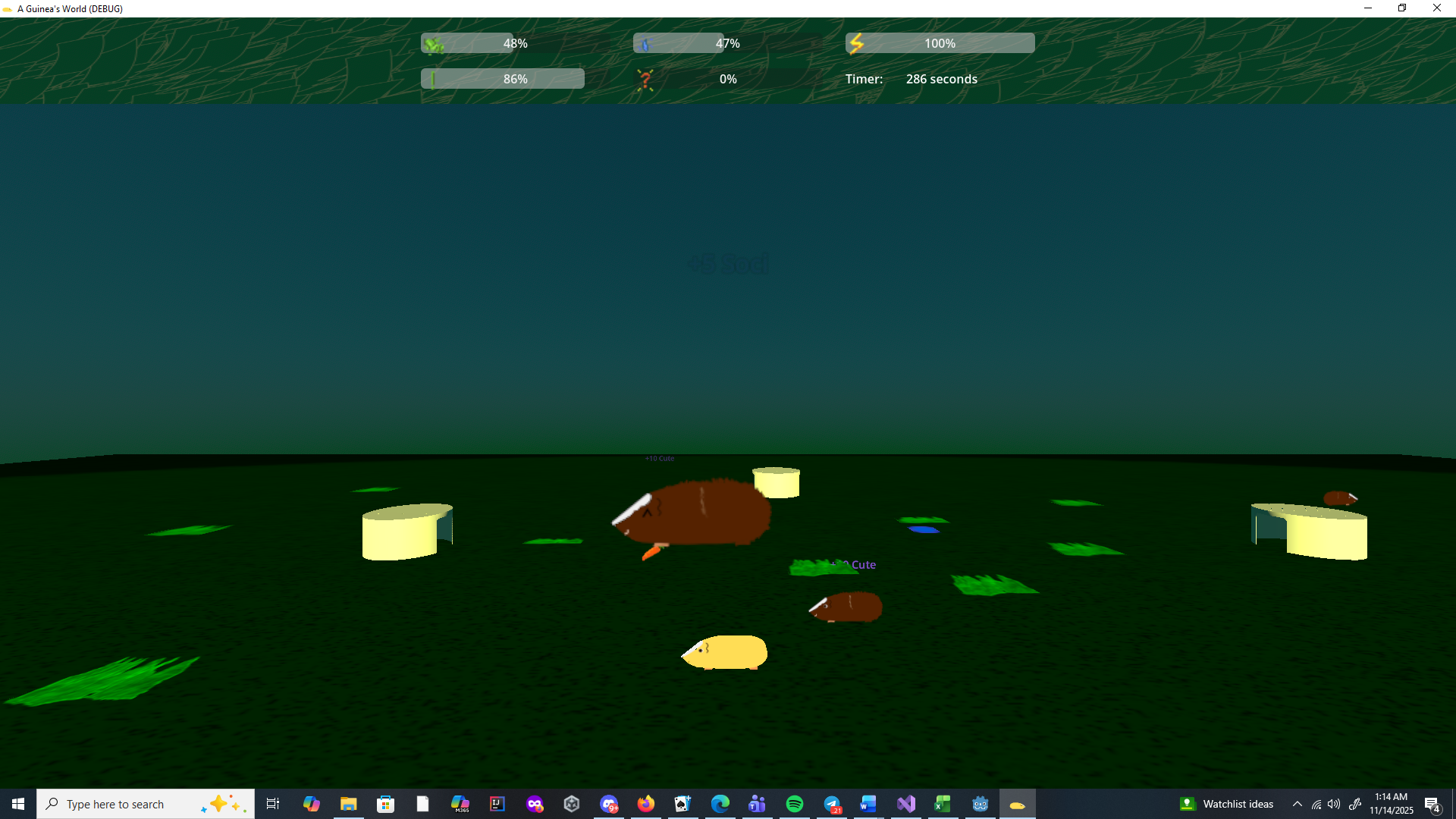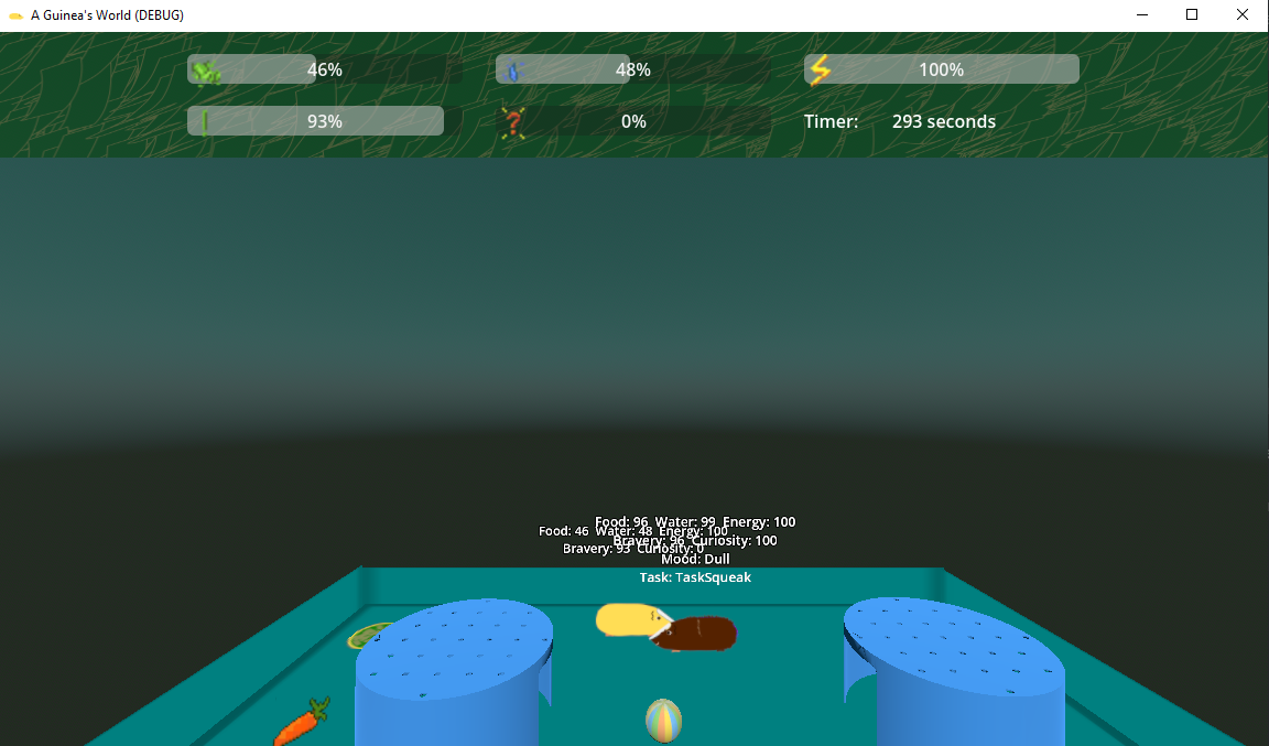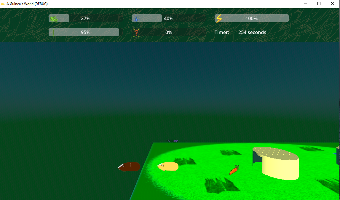 Playing as a guinea pig in a tiny world is a fun concept. The animations like wiggling and napping were charming. I struggled a bit with the interface scaling on my PC, but I understand time constraints during a jam. Looking forward to seeing how this develops further