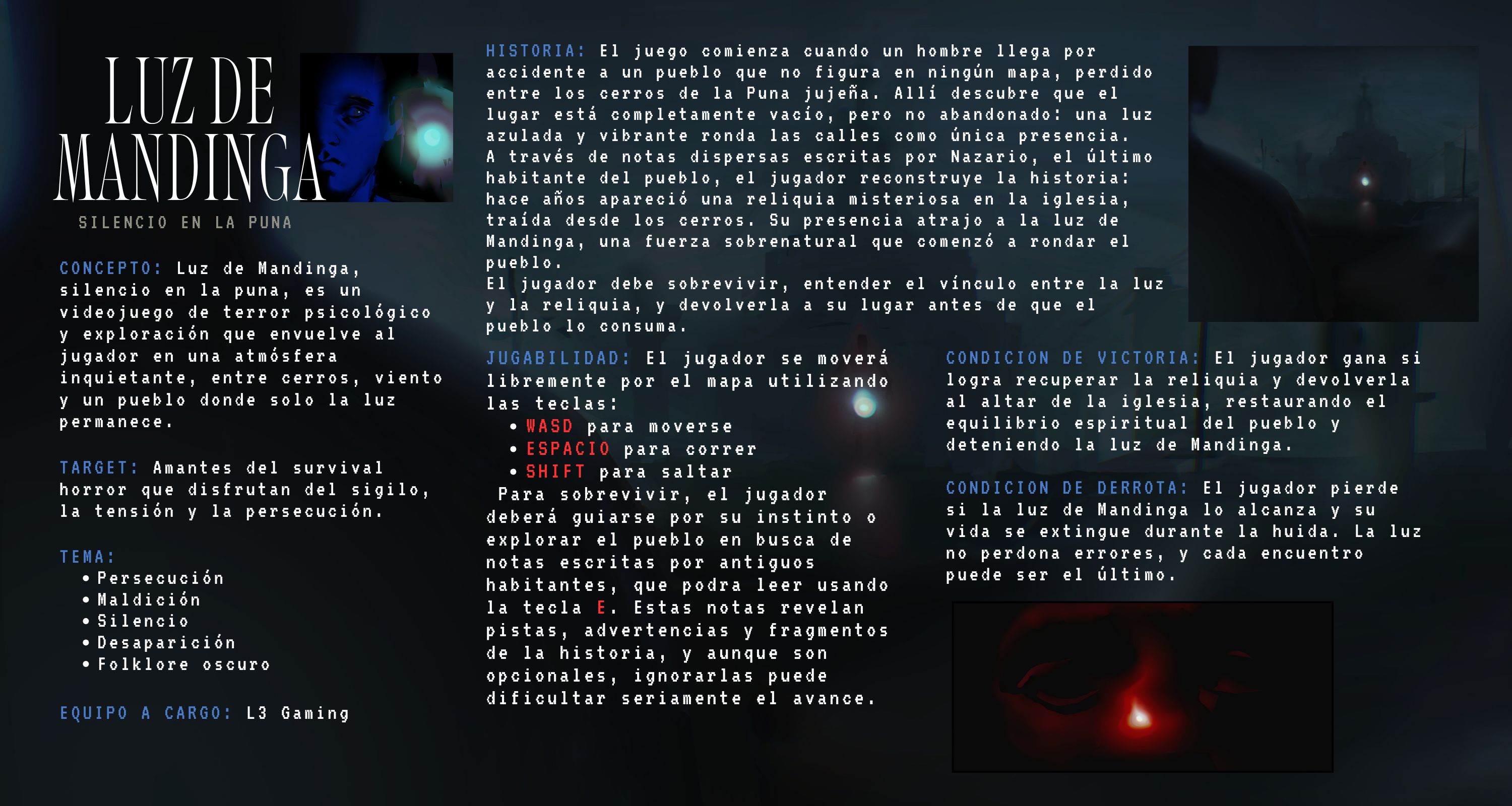 En el Eje cultural quisimos adaptar la historia del farol de mandinga en un pueblo abandonado de la puna, nuestro protagonista Antonio se quedo varado tras una falla mecánica en su auto y es acosado por “La luz mala” la cual lo acosará mientras por medio de las notas intenta revelar el misterio tras el pueblo y encerrar a la luz para poder escapar
