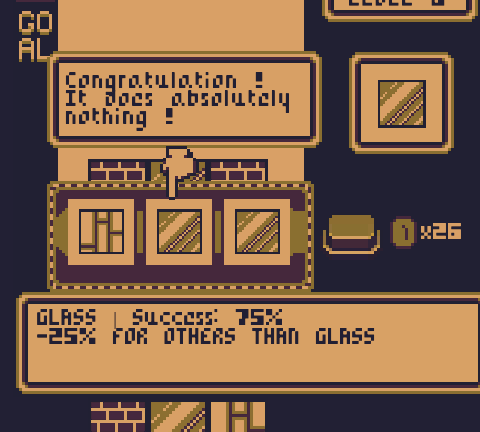 I really like the idea here. My only issue was that I couldn't really grasp what the connection was between the block types, and their potential success, or destruction. I didn't find the descriptions of the block powers particularly helpful either in that regard - other than to realise there was a % chance involved in successful placement (which in fairness is appropriate for the jam theme).
