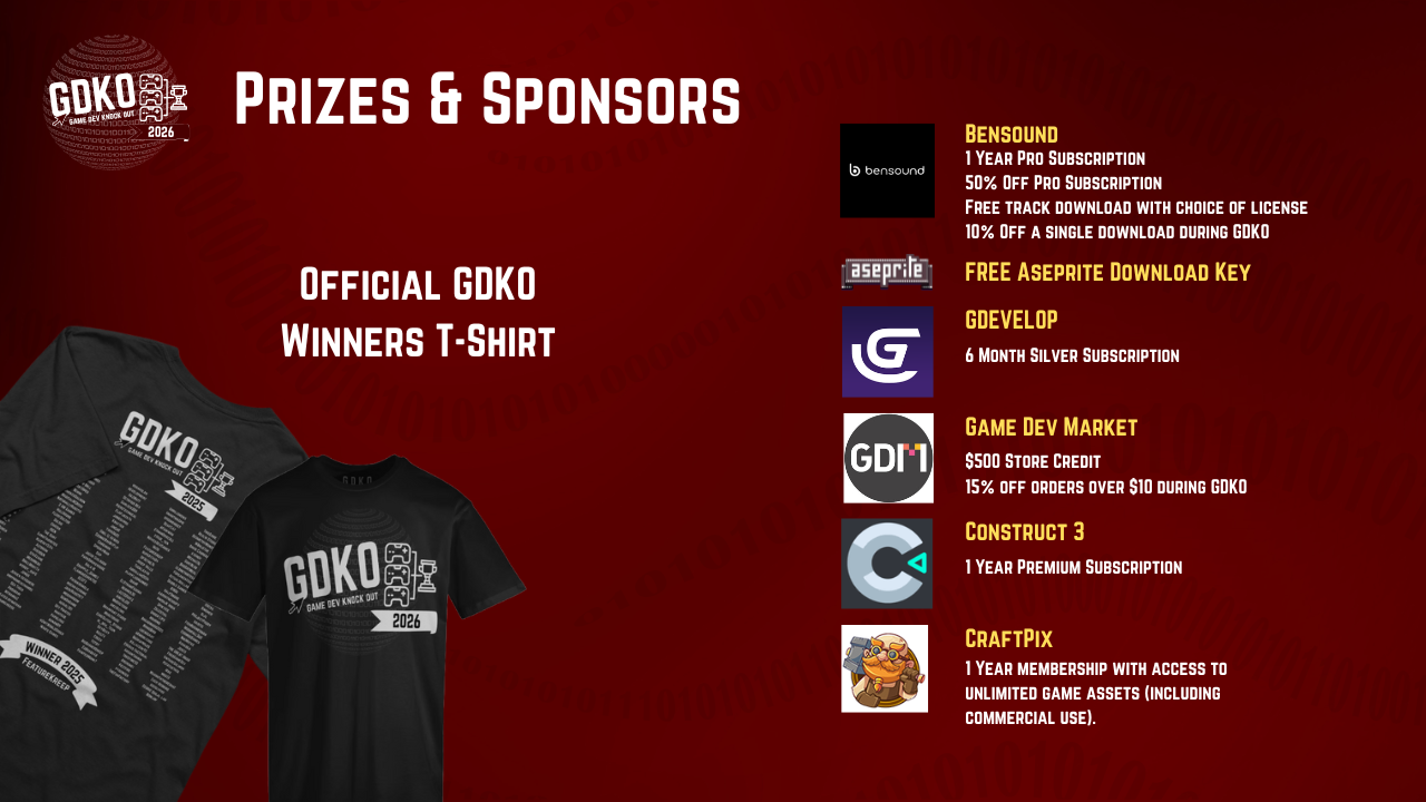 The winner of GDKO 2026 will receive a GDKO 2026 winners T-Shirt (Shipped worldwide). Other prizes from our sponsors to be giving away during the competition.