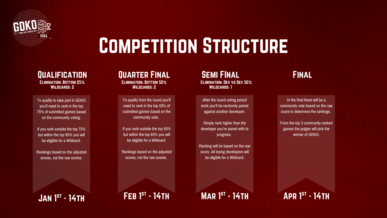 GDKO will run for 4 rounds with round 4 being the final. Each round will last 2 weeks with a community voting period at the end. The final of GDKO will take place during the first 2 weeks of April and the top 3 community voted games in the final round will be judged by the GDKO judges and an overall winner will be crowned.