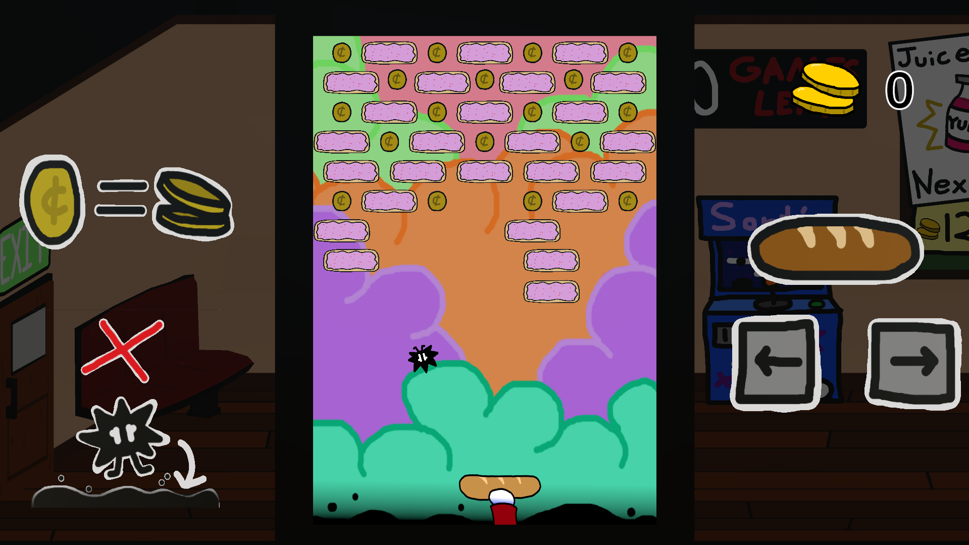 Speaking of the Breakout - and I never thought I'd care enough to praise Breakout mechanics?? - I really like how the acceleration/deceleration of the urchin causes things to snowball! Because it only slows down a little bit every time you hit the ball with the center of the bread, it makes the game a lot more hectic than I'm used to. It's good! Same with it slowly accelerating if you hit it towards the edge, but that seems a bit inconsistent due to the much stronger angular effect also on the edge. Works very well anyway though c: