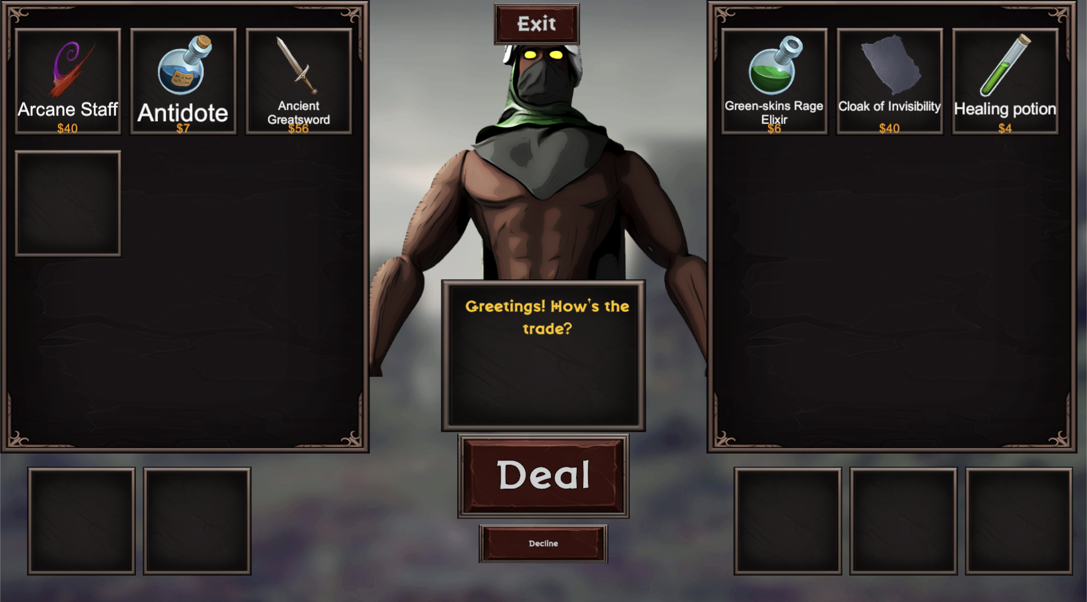 Art is great, the gameplay is a little confusing, and I think there should have been gold? or buy vs. sell prices so it's more "profiting" as a merchant? Anyway, good work!