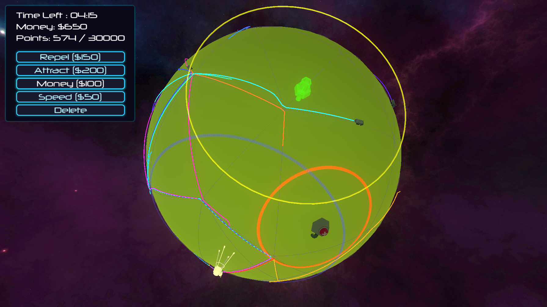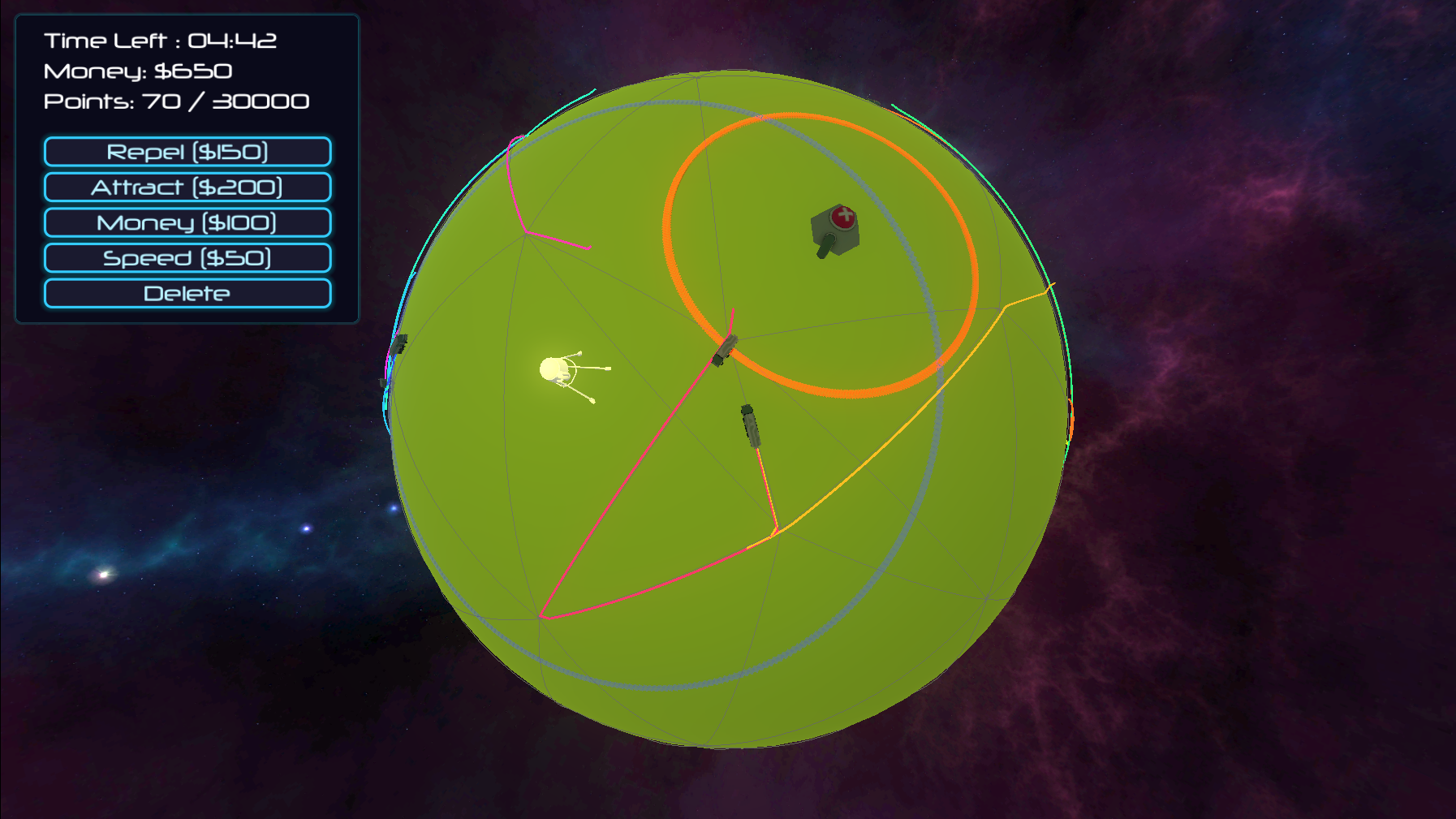 Very creative idea. The core of directing trucks around the planet was really good concept. Just was overwhelmed by all of the colors and tiny trucks driving around. Also felt that towers should have been more costly so that placing them would be more intentional. The camera control was very good for a planetoid along with the background. Congrats on submitting!