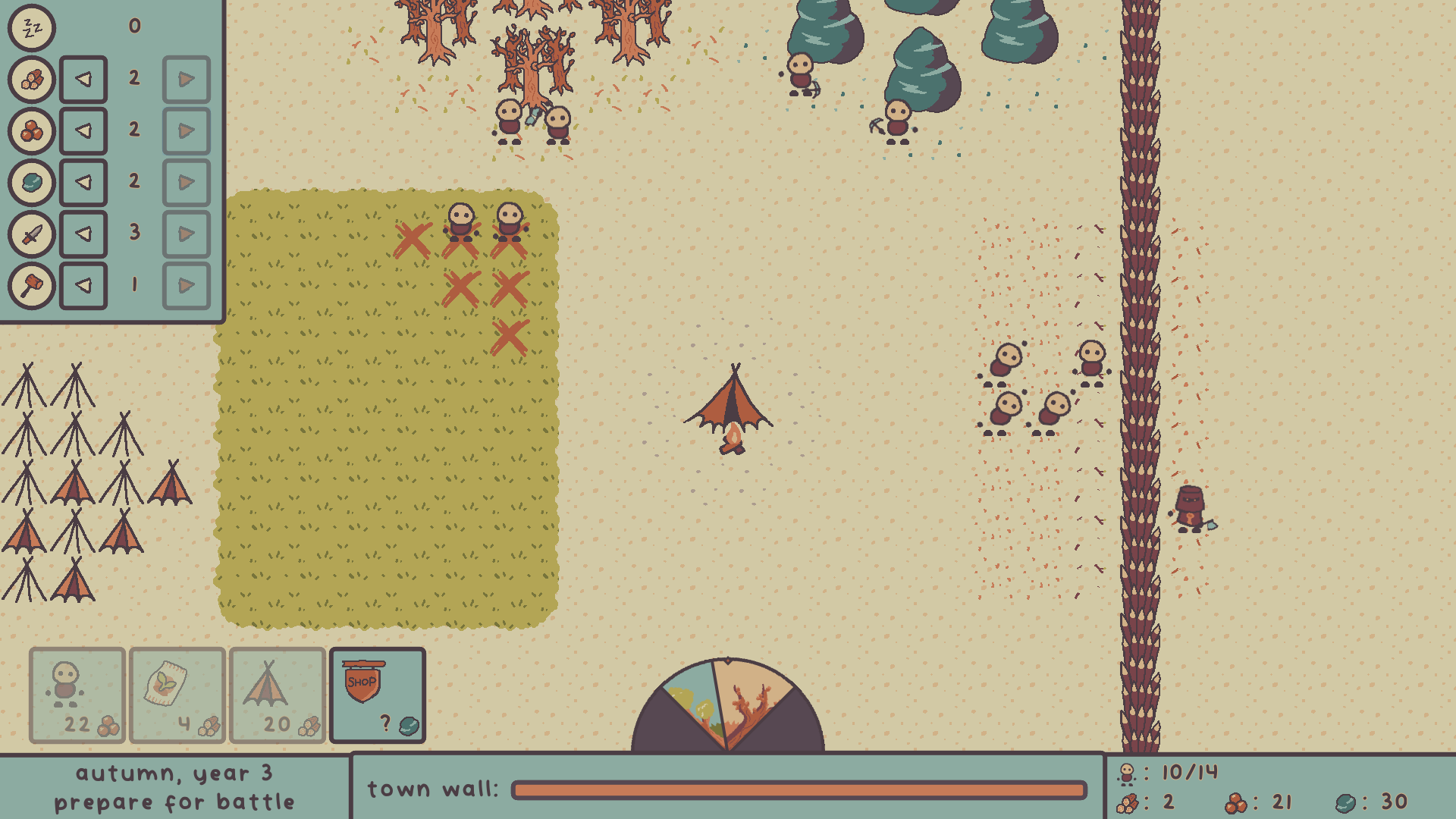 The artstyle is simple yet beautiful thanks to that wonderful color palette, the sounds are just right and make any action feel very satisfying, the waay you made a natural gameplay loop with just a few mechanics tied to the seasons is genius and the battles are well balanced and the fact that you NEED both builders and fighters makes them high-stakes and interesting.