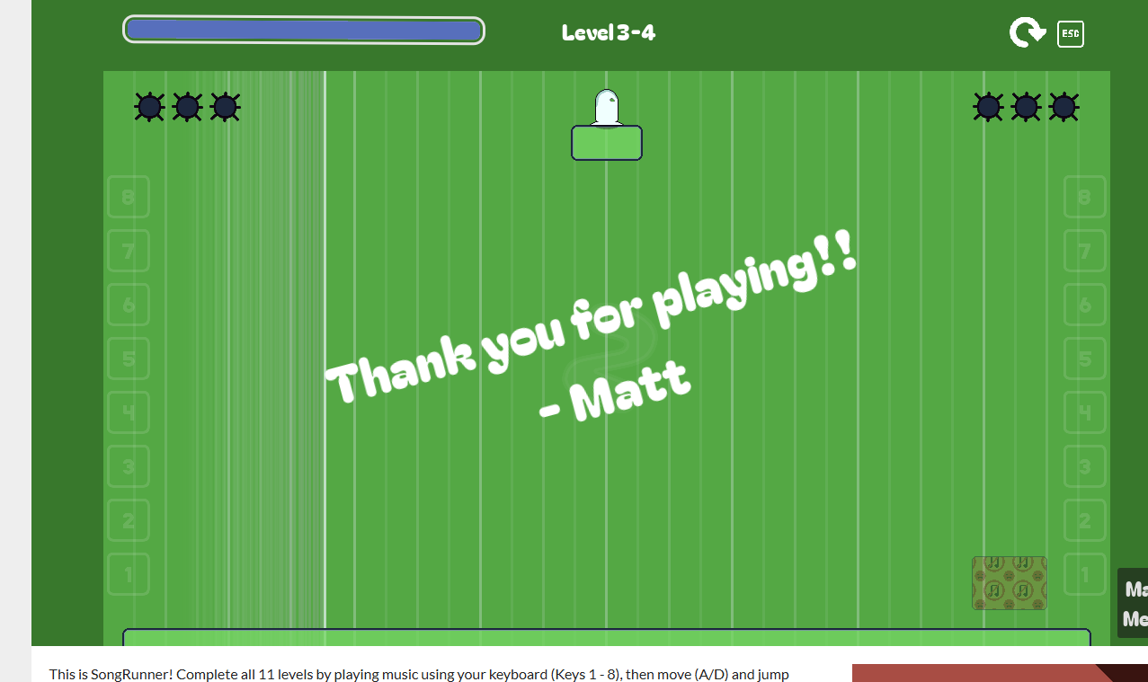 Sometimes waiting for the music player to come back around if you missed the note by one tile was annoying, but it wasn't that big of an issue due to how short the levels and game was overall, some sort of reward for completing the levels as fast as possible or with as few music meter used up as possible would be a great addition imo, as it would hopefully reward players that play in a more risky and fast passed way, and would give more replay value.