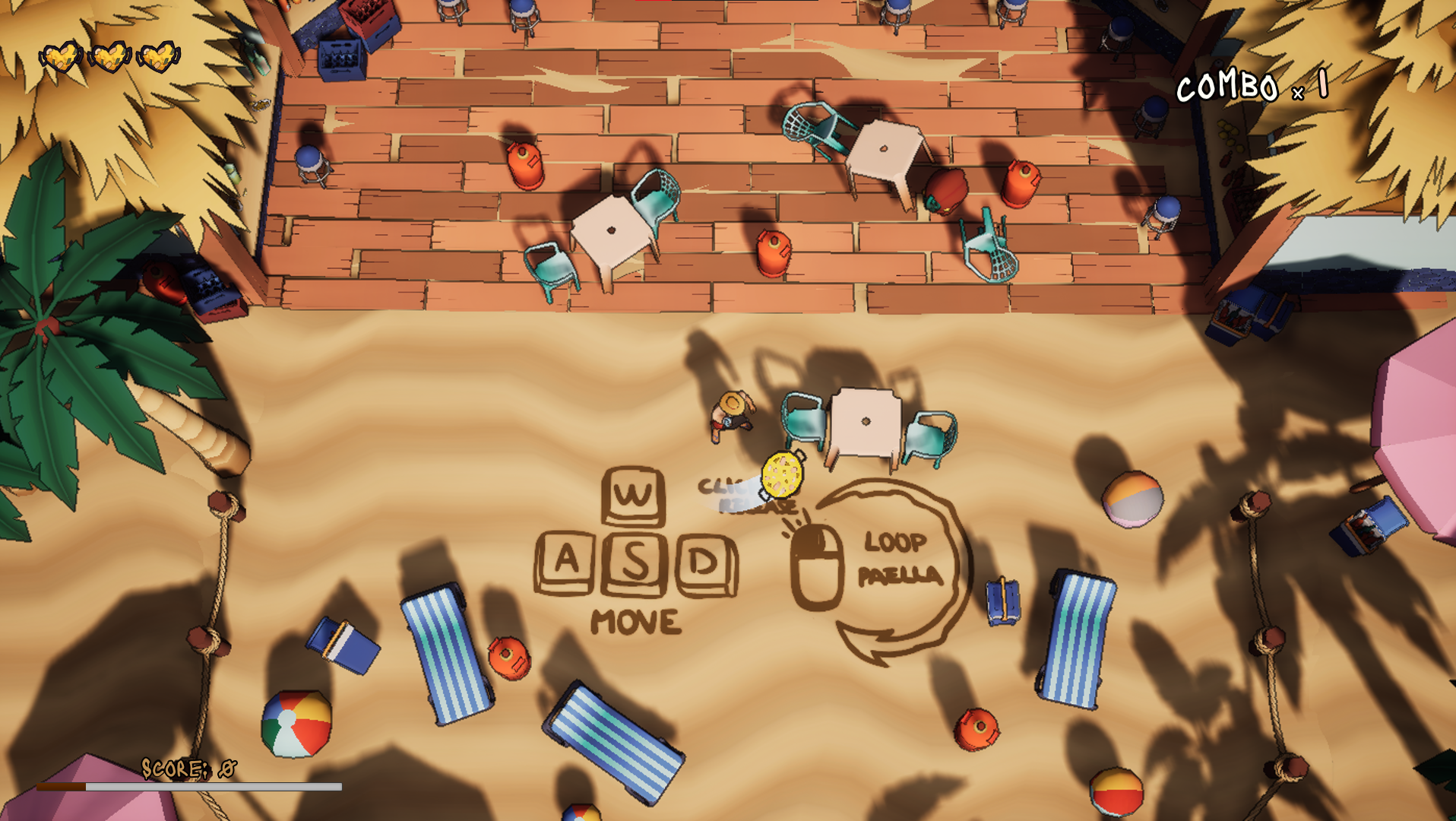 Loop was used as the main inspiration of the Paella toss mechanic, where you have to loop your mouse on circles to throw the paella, which bounces and comes back to you, loop also inspired the arcade bullet hell gameplay, where you play on an infinite Loop. Also we hopefully will throw Mark's expectations for a loop making a game about paellas.