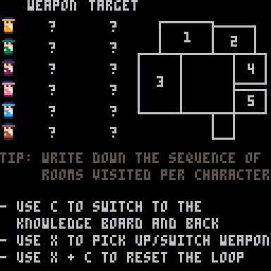 Very cool and fun! I love how you have to learn which people need which weapons and then stop them from getting them! It's a very cool take on classic murder mysteries by making the player have to prevent all the murders! I had a great time and I loved the art and music! Great job!