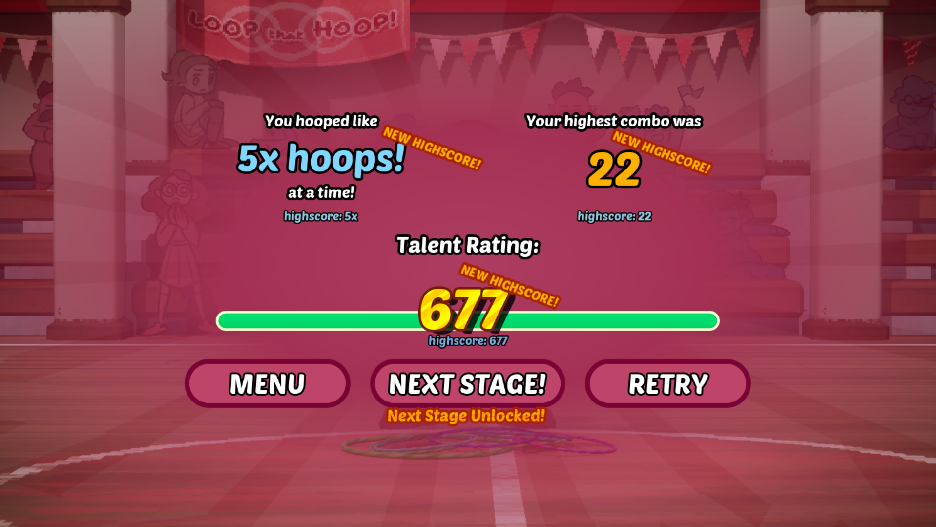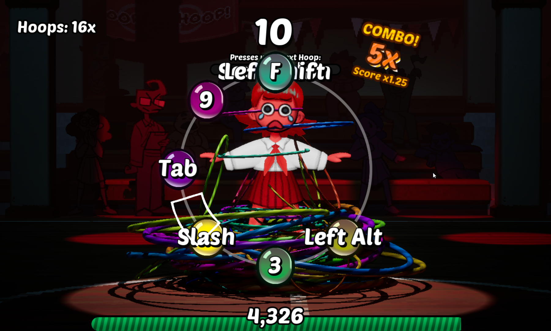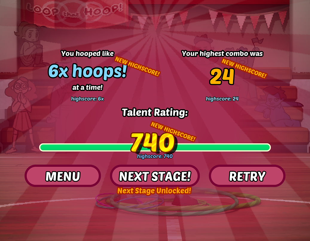 Amazing game, and good use of the theme, thematically, and gameplay wise, in that you have to press keys over and over. I got a lot of combos off of just pressing a certain key many times, and basically kinda ignored if there were too many keys. It would be cool to see a rhythm element introduced, because I could see that happening, with a cue every time the hoop gets to the top. . Art was incredible no notes.