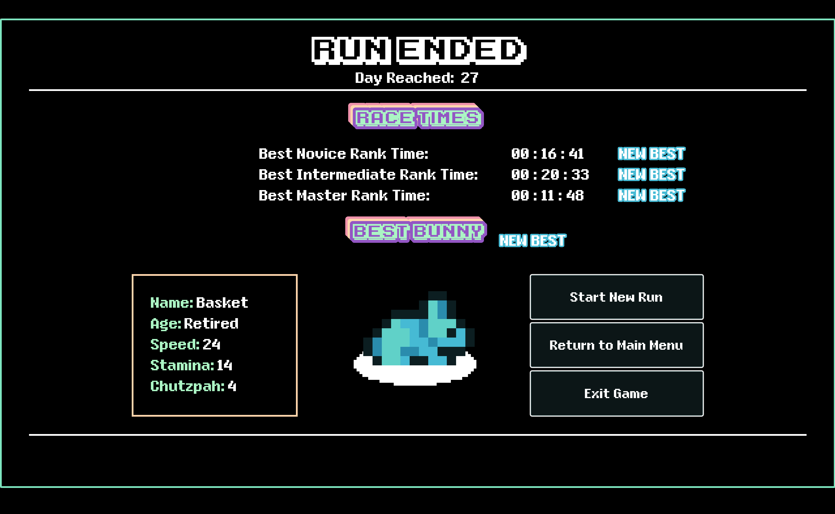 I spent an embarrassingly long time playing this game (shoutout to my boy Banana for winning so many races). This was SO fun, I think the theme adherence is a bit ... iffy but I had so much fun I kind of don't even care! The art style is SO cute, the SFX during the racing is really satisfying (especially hearing your competitors tire out when you're in the lead), I am very impressed by this submission. I could absolutely see myself purchasing this on Steam and just losing hours to making the best bunny ever. Great job!