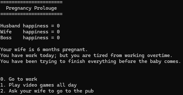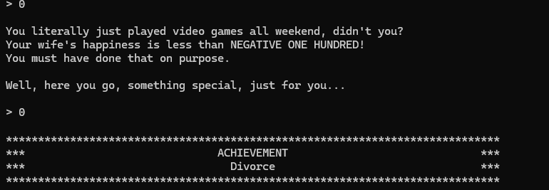 lmao note to self, speed running divorce is an option. Neat concept, well executed, would be interesting in seeing what you would add with more time.